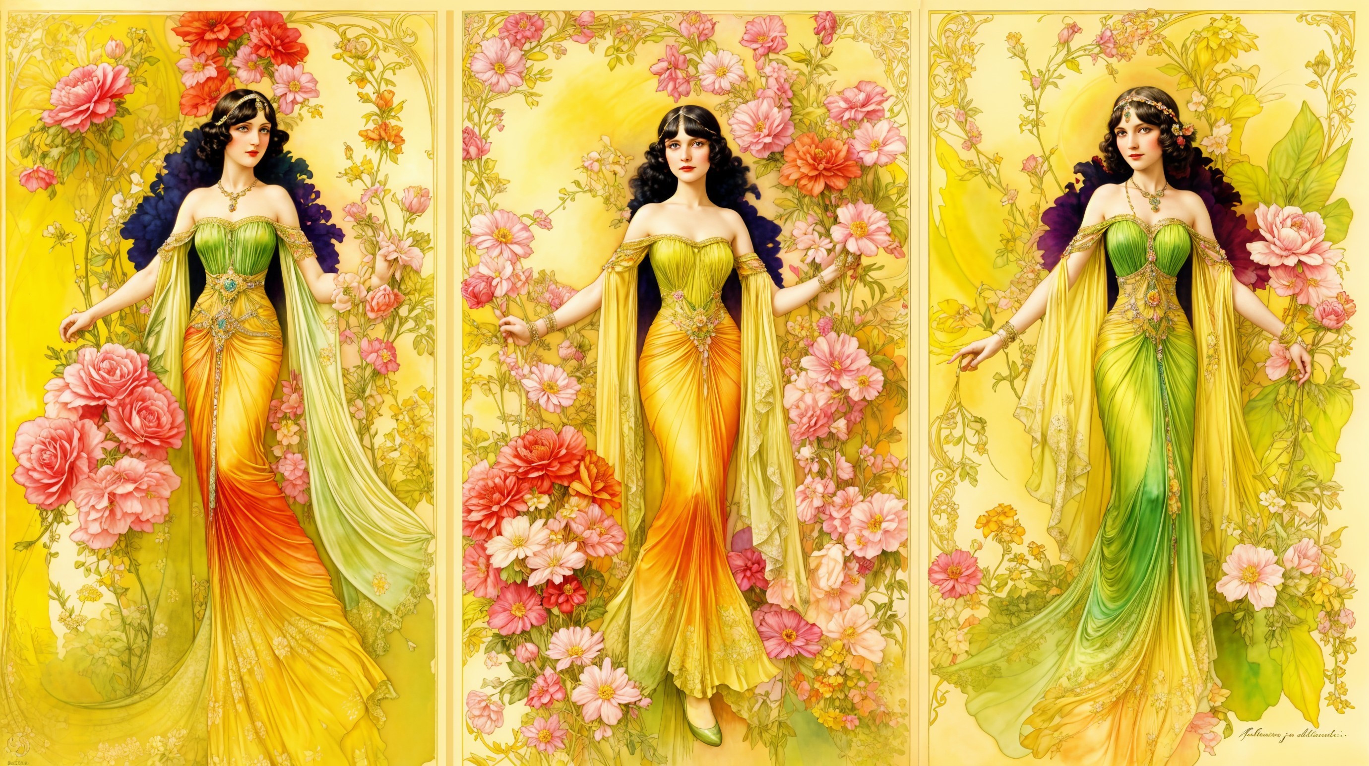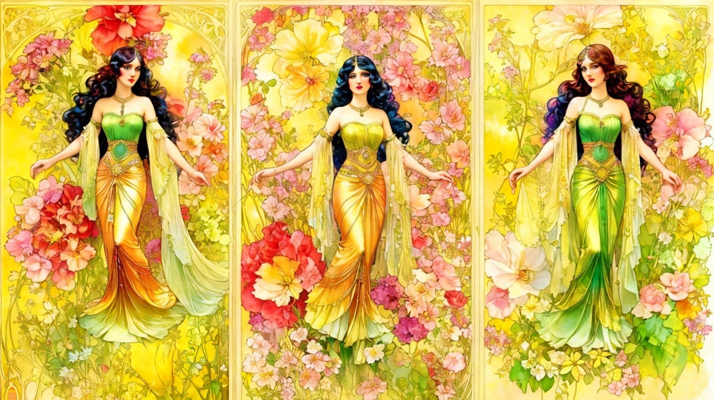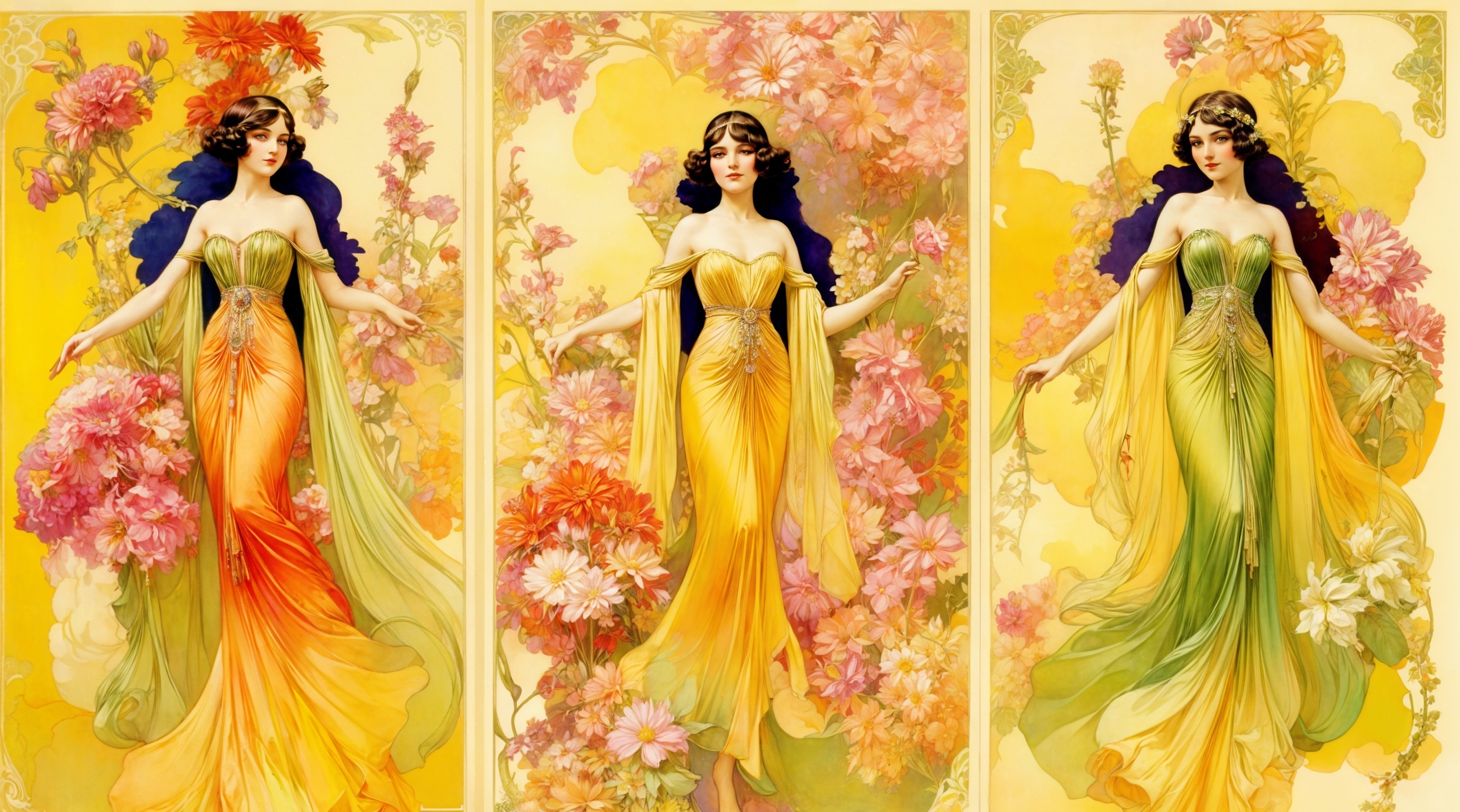 The image features three enchanting women in long, flowing gowns adorned with floral patterns. Each gown transitions through vibrant colors—orange, yellow, and green—set against lush backdrops of blossoms.