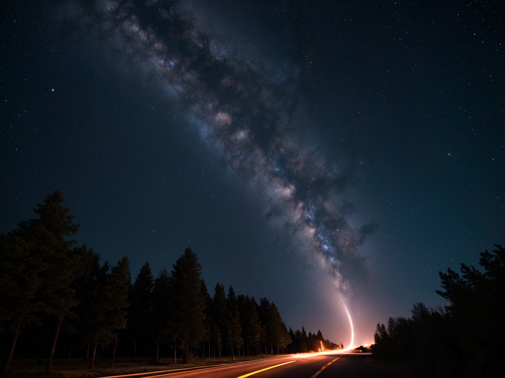 A stunning night sky showcases the Milky Way stretching across the scene, dotted with bright stars and shooting meteors. Trees line the roadside, illuminated by distant lights.