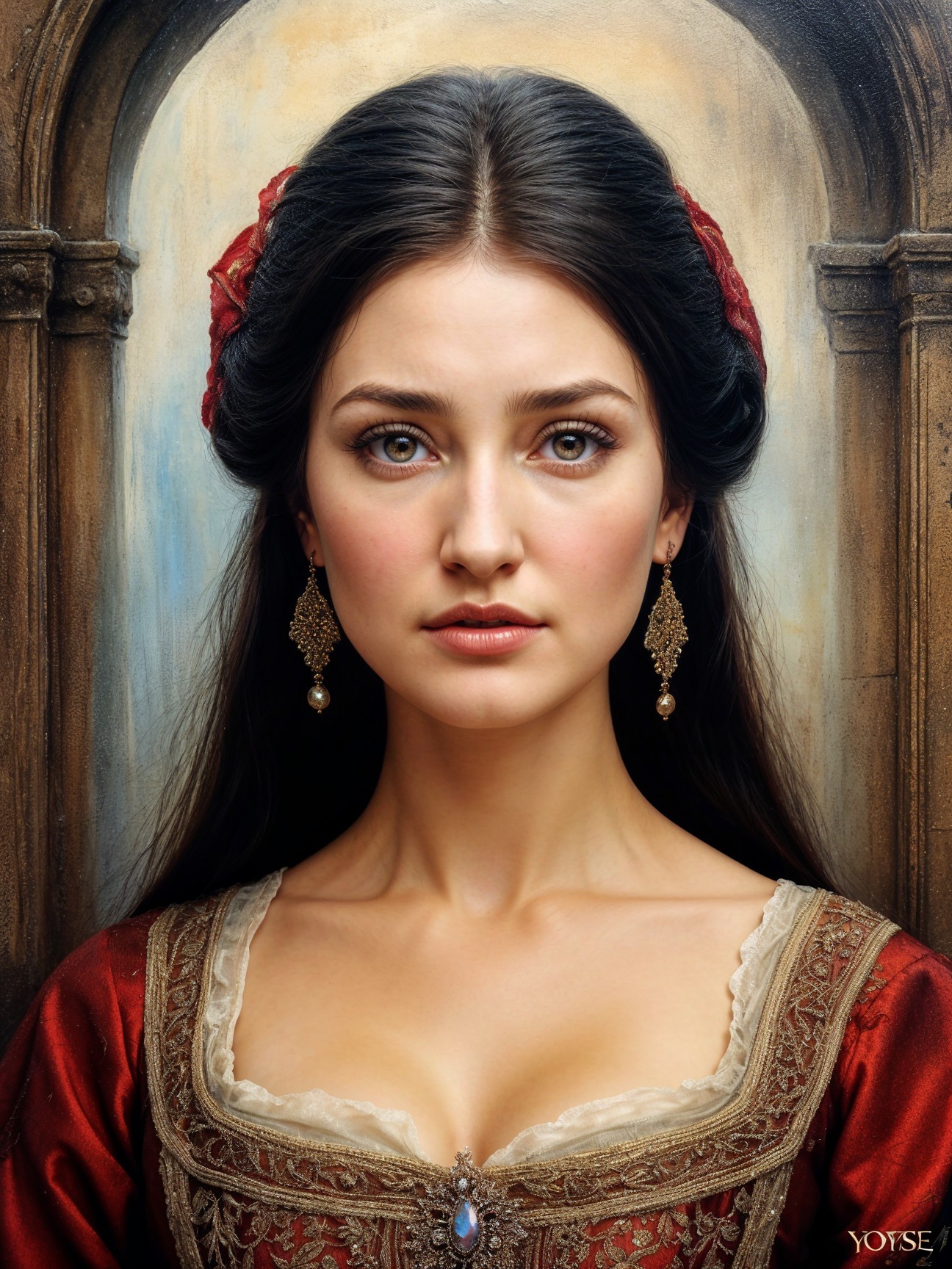A serene young woman with long, dark hair gazes softly at the viewer. She has expressive eyes and a natural complexion, wearing a delicate, pastel-colored dress against a softly blurred background.