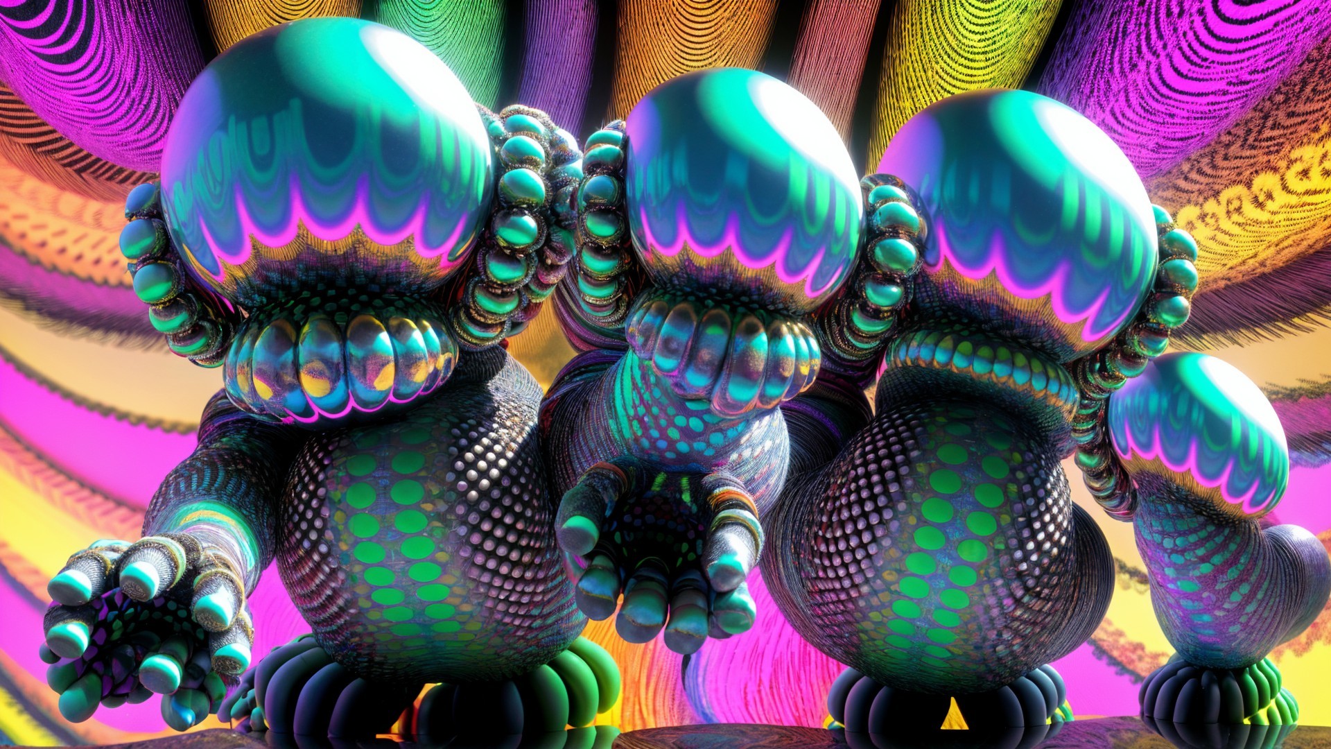 A colorful landscape of fantastical, mushroom-like forms in vibrant purples, greens, and blues. The whimsical shapes rise from a textured ground, creating an otherworldly atmosphere.