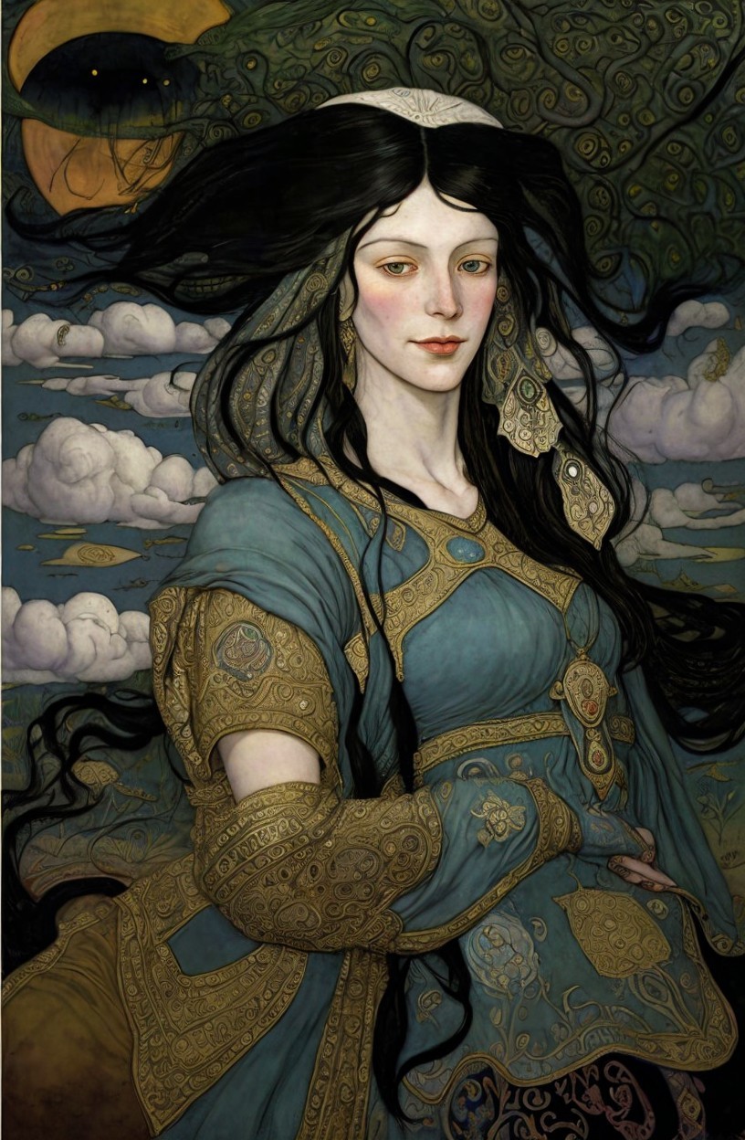 + Prompt:Beautiful goddess. 3rd century Persian miniature art Mysterious, ethereal, alluring . Enigmatic smile. Beautiful clouds at dawn. , andrew wyeth, edward gorey, hope gangloff, spare style, liminal