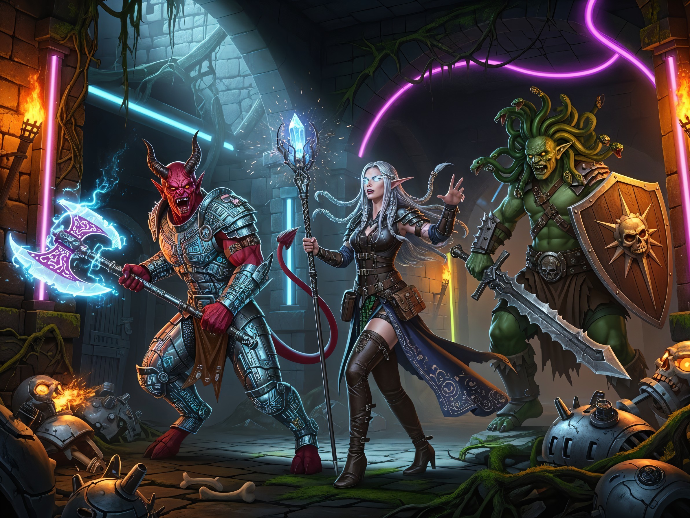 A Demon, a Gorgon-troll and an Elven witch unite to explore the Techno Dungeons of Pax, strange bedfellows indeed...