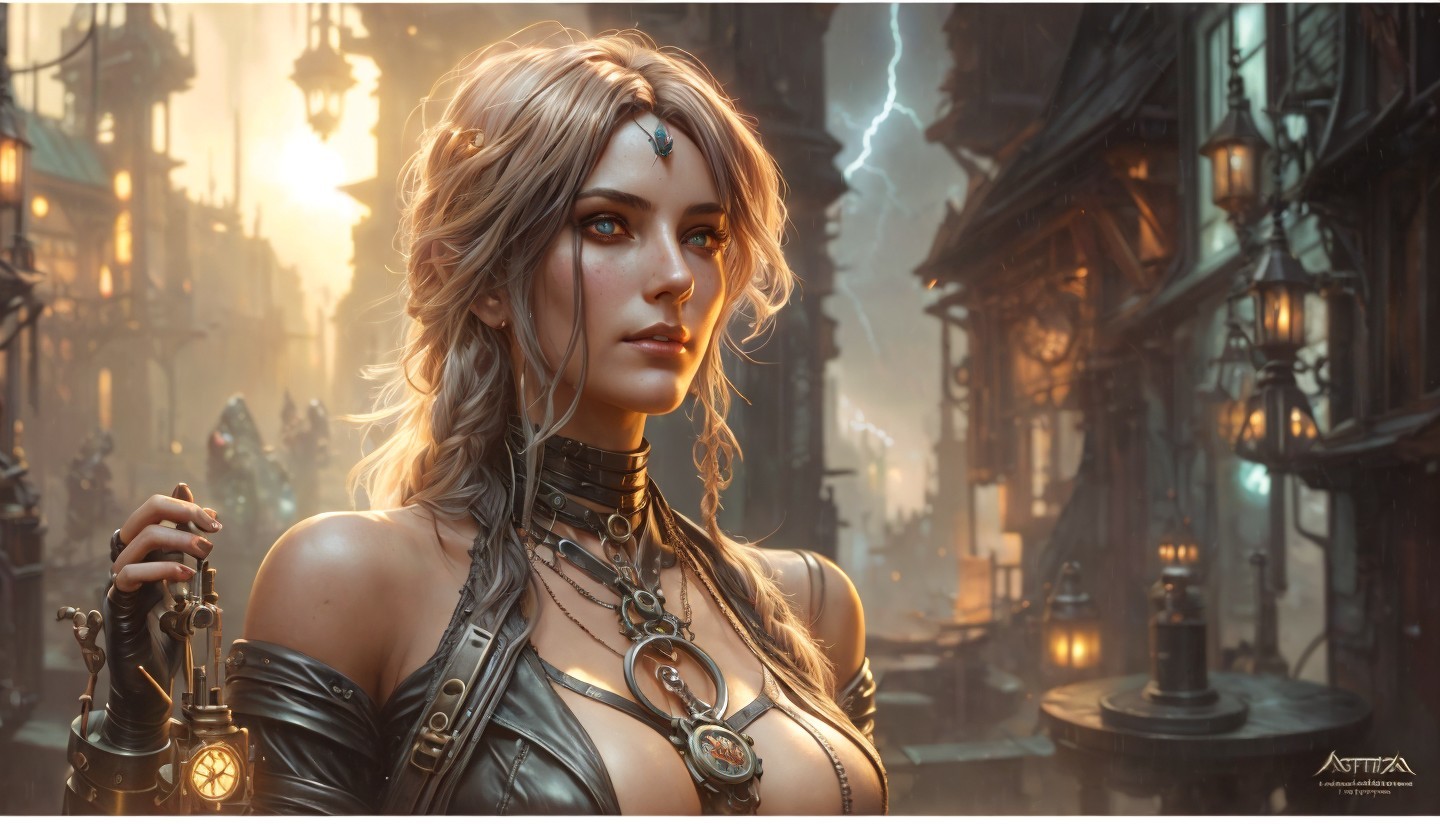 Prompt: Cyberpunk witch, workshop filled with clockwork potions steaming machines and bubbling stations, insidious shadows and storms raging outside, bronze and dark wood