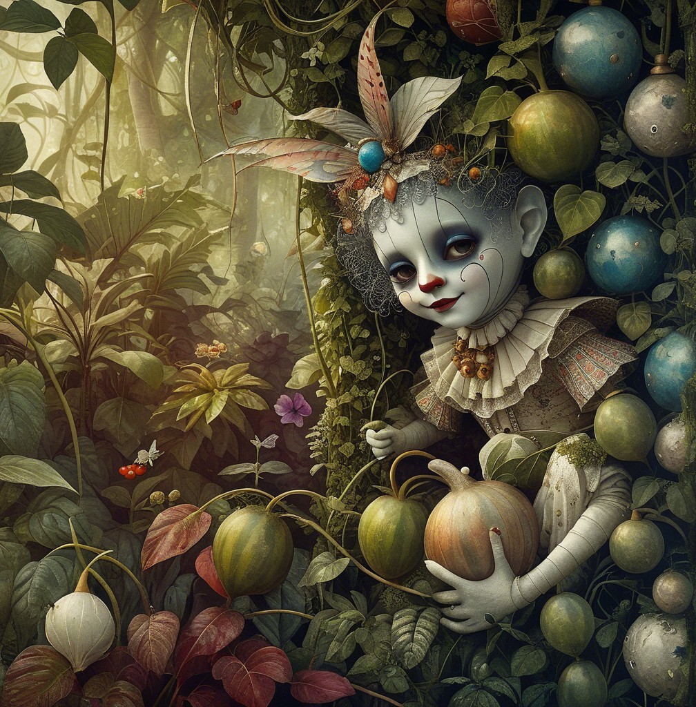 Close up, impish devious Pierrot creature in a garden jungle maze, in the style of Alexander Jansson. by Catrin Welz-Stein, Michael Parkes