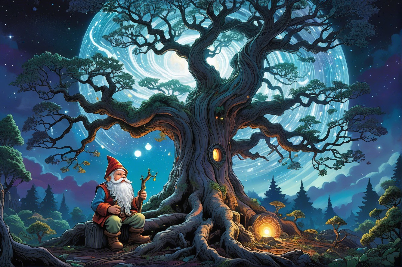 A whimsical illustration of a gnome sitting on a tree stump under a massive, gnarled tree with glowing orbs in its branches and a light emanating from a circular opening in its trunk. The tree dominates the frame, its wide, twisting branches spreading across the top and its thick roots anchoring it to
