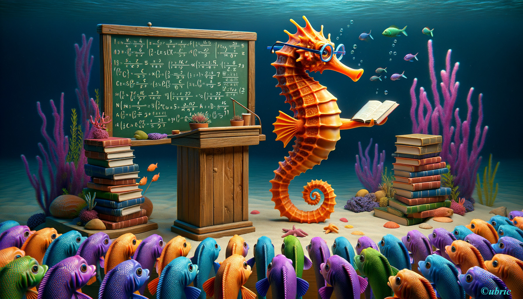 A seahorse wearing glasses lectures to a colorful crowd of fish in a whimsical underwater classroom with a blackboard and books.
