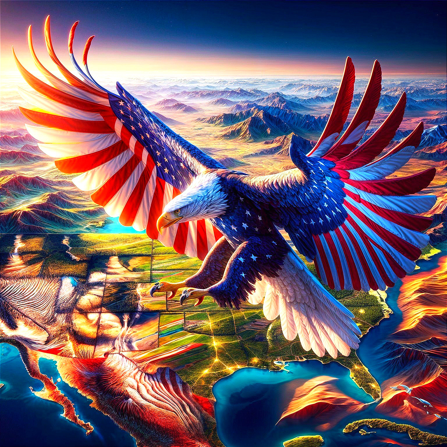 A majestic eagle, adorned in the colors of the American flag, soars above vibrant landscapes and mountains, symbolizing freedom and patriotism in a breathtaking, vivid setting.