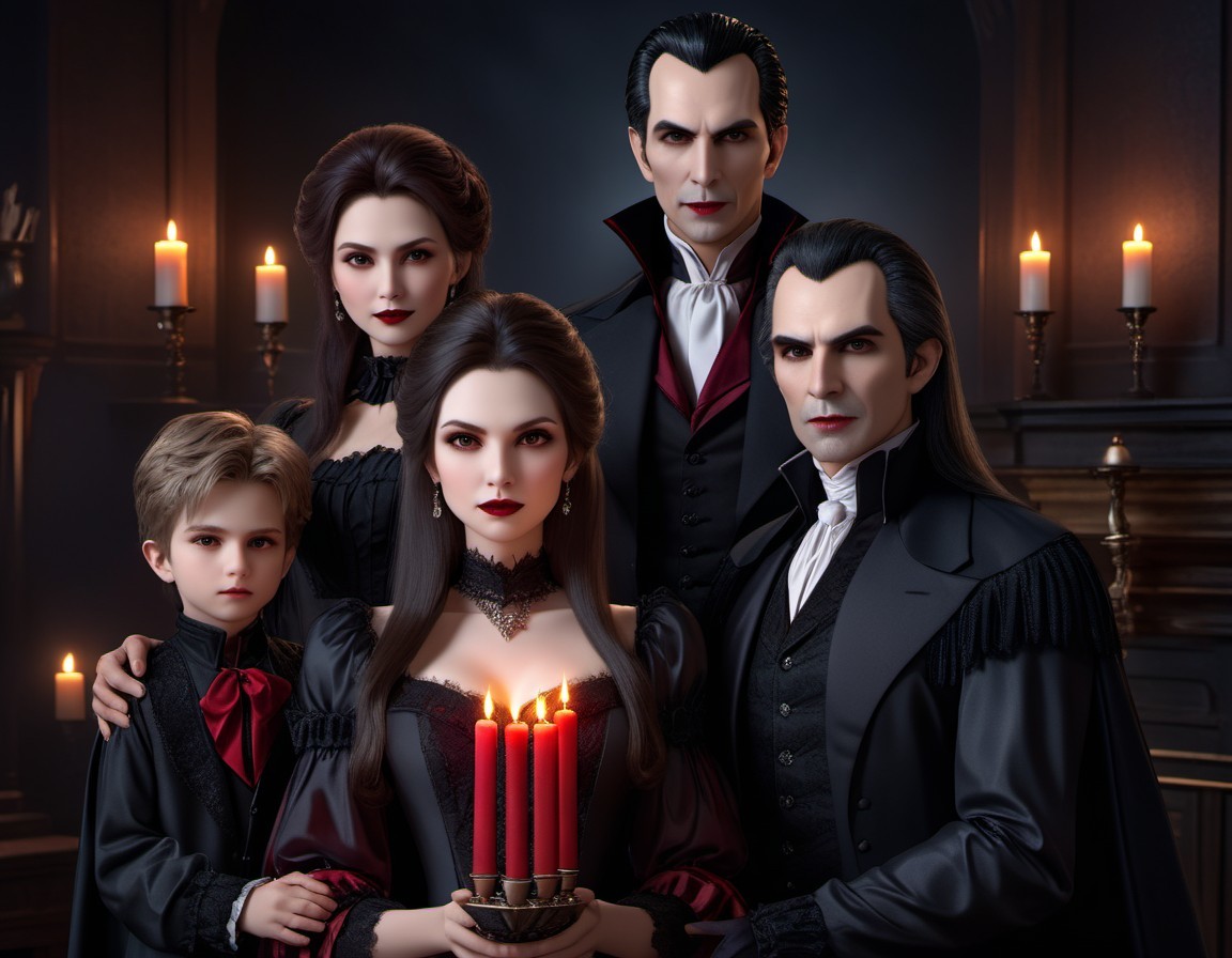 vampire family ,wife, dad and couple of sons. dark wear, palid face, realistic face, natural vampire colors, dark room, candles light, 8k, masterpiece, close up