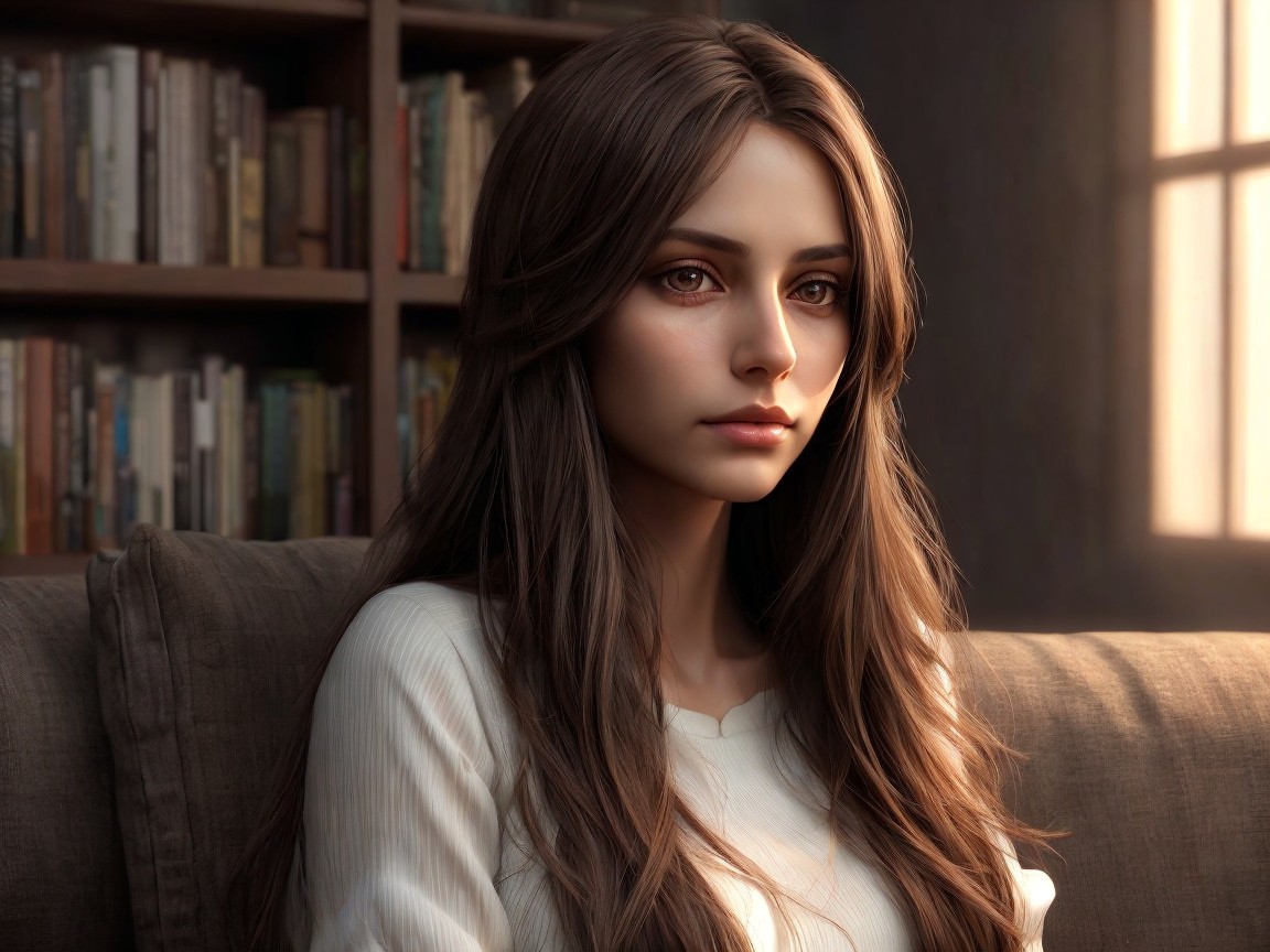 A young woman with long, flowing hair sits in a cozy library, bathed in soft natural light. She gazes thoughtfully, surrounded by shelves of books. Her expression is serene and introspective.