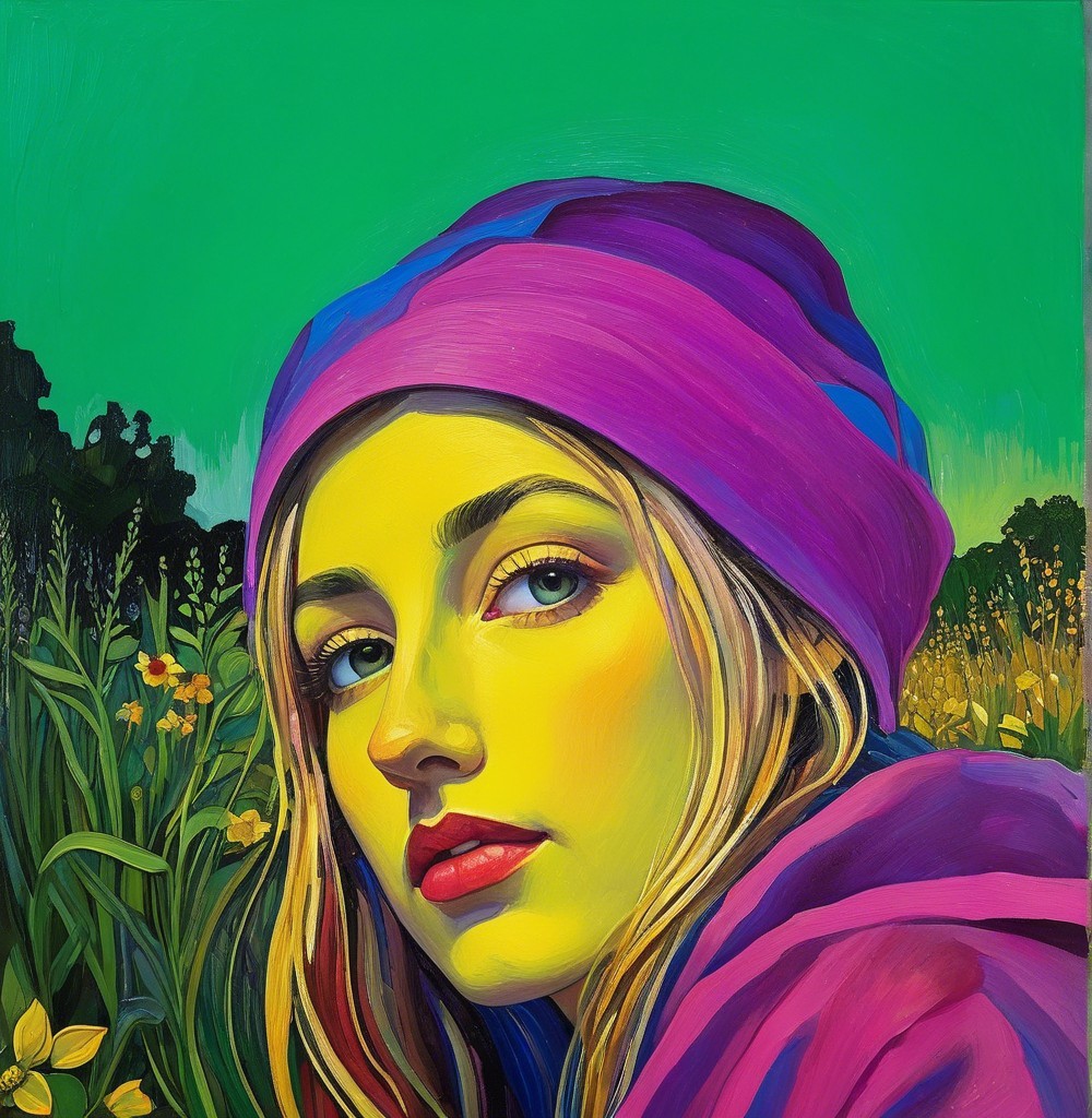 Prompt: Vibrant and expressive portrait, reminiscent of Shara Hughes' style, intricate wet-on-wet technique inspired by William Adolphe Bouguereau, orphism, tonalism, pointilism theme, thickened material, quilling, simplistic, dyed, spiritual, stippled blotting, muscular, sculpted, cel-shaded, straight, tesselated, retropunk 1.9, american gothic 1.7, natural dreamscape, traumacore 1.9, layered hues akin to August Macke, coloring influences from Benno Hauber and Hugo Pratt, light color glitch, oil blend with airbrush and watercolor overspray, captivating lighting effects by Overton Loyd and Ho Baron, a blend of dark fantasy and tonalism, detailed with fluffy textures and soft line-art, incorporating paper fibers, plasticity 1.3 for depth, raytraced shadows for realism, micro-pen lines for precision, splash ink technique reminiscent of Marc Allante, extreme chiaroscuro effect for dramatic contrasts. The overall composition exudes beauty and gorgeousness, drawing inspiration from Didier Lourenço and Benno Hauber's styles. Subsurface scattering 1.2, cel-shaded, sculpted, fabulous, gorgeous, watercolor wash.