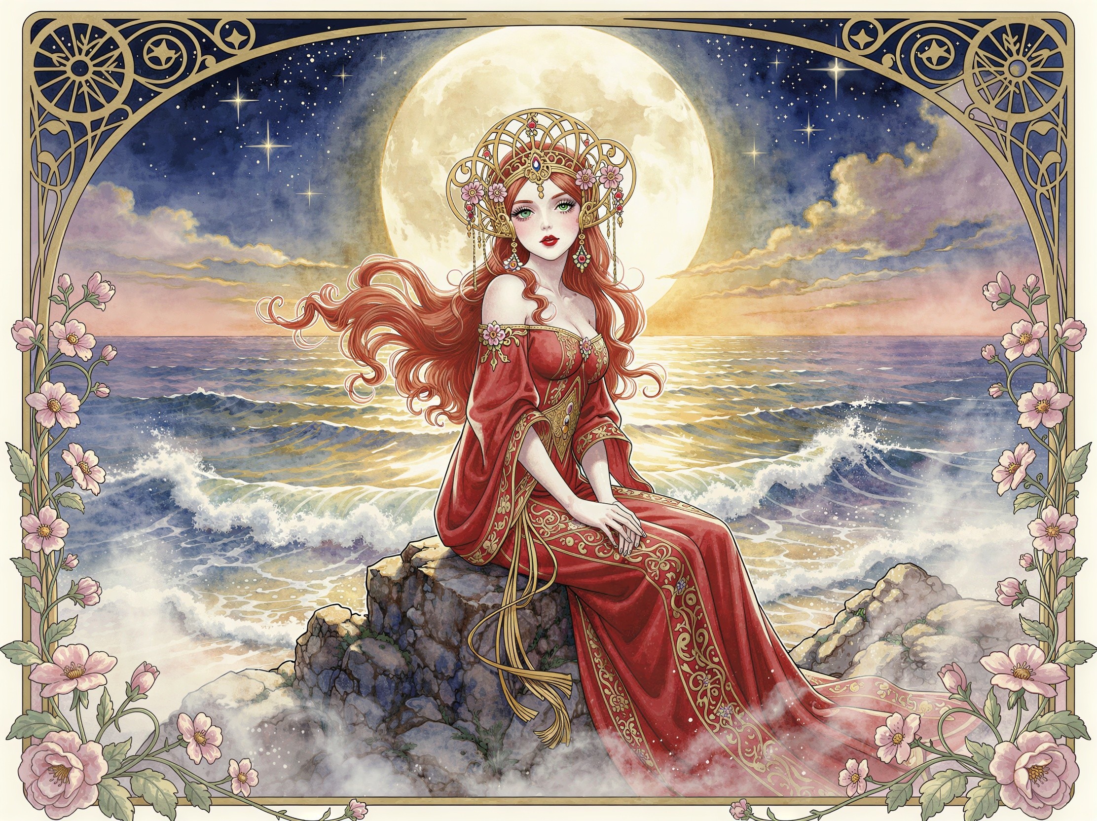 ((A masterpiece of unparalleled excellence)), (((Amidst the whisper of a mysterious scene, a stunning woman with a slender figure captures the imagination. Her long, wavy red hair dances in the wind, crowned with an exquisite golden headdress crafted in the intricate and delicate style of the Art Nouveau movement, Her skin, as white as snow, contrasts beautifully with her plump, ruby-red lips, Her eyes are an enchanting green, sparkling like emeralds, drawing you into their depths, Draped in a charming, finely embroidered red dress, she sits gracefully on a rocky outcrop, framed against a dramatic twilight sky, The vast expanse behind her is dominated by a huge, bright full moon, casting its golden glow upon the sea, In this dreamy landscape, the starry sky twinkles under the moonlight, A mesmerizing blend of blue and gold that dances like rolling waves. soft morning light, flowers, hazy, soft, charming, mysterious, mesmerizing, delicate, intricate, dreamy. The scene is bathed in soft light and pastel tones, creating a romantic fairytale atmosphere, a tranquil atmosphere, alcohol ink, pen, illustration, watercolor, whimsical style, bright colors, detailed floral elements, dreamlike setting, Soft lighting, charming atmosphere))), Stunning Chinese watercolors, Pen and Ink, Pencil drawings, as if created by Arthur Rackham, Ernst Haeckel.