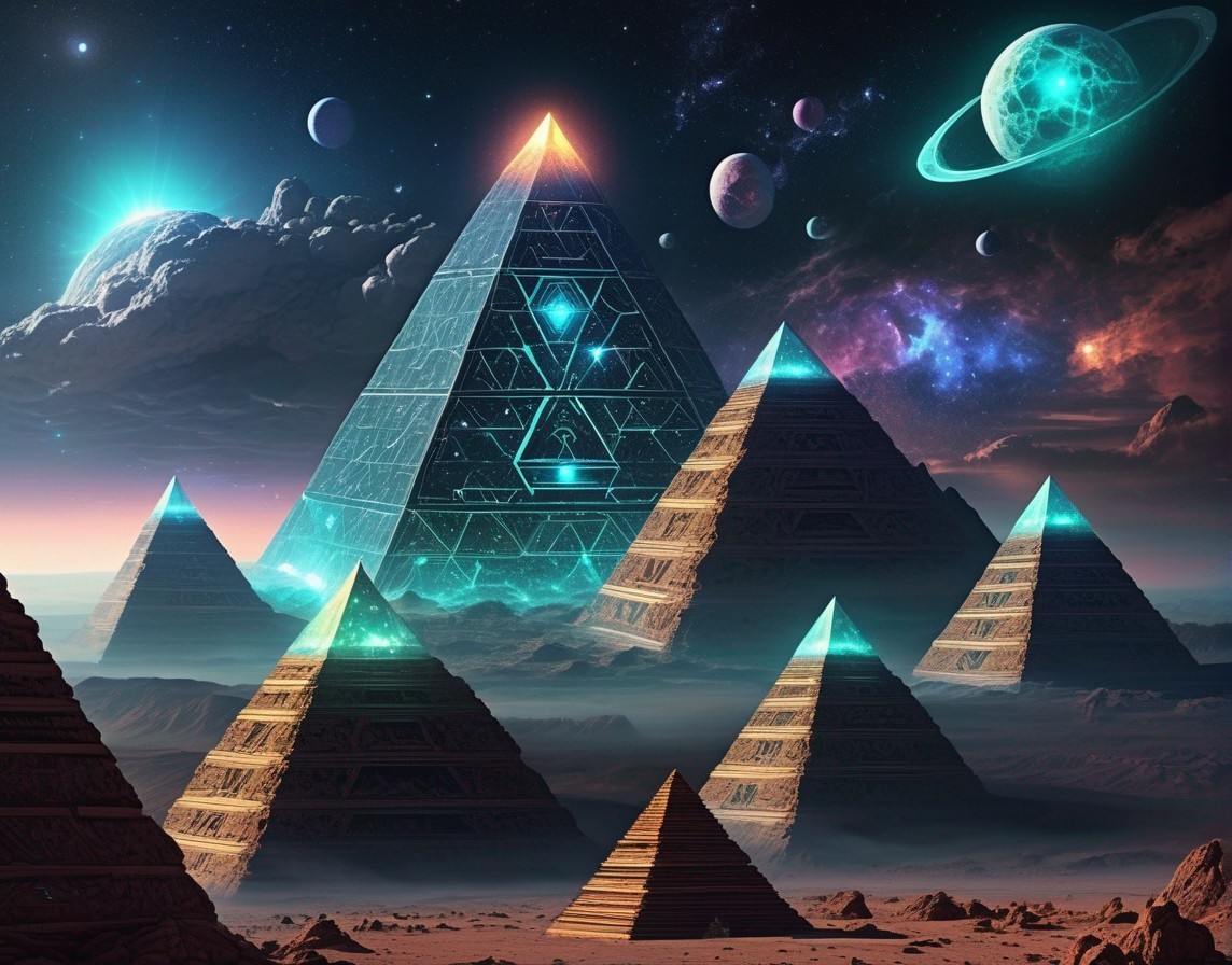 Prompt: High-tech extraterrestrial pyramid assimilated with arcane sacred geometric patterns and advanced alien technology. glowing phosphorescent runes and mineral crystals. geometric patterns, honeycomb (hexagon) patterns. The sun, moon, and planets amongst billowing clouds of nebula in the sky. Ultra Realistic landscape under a complex cosmic sky. Enigmatic astral projection/alien contact, galactic LSD art, surreal psychedelic vibes, sci-fi LSD art. In the style of Cameron Gray