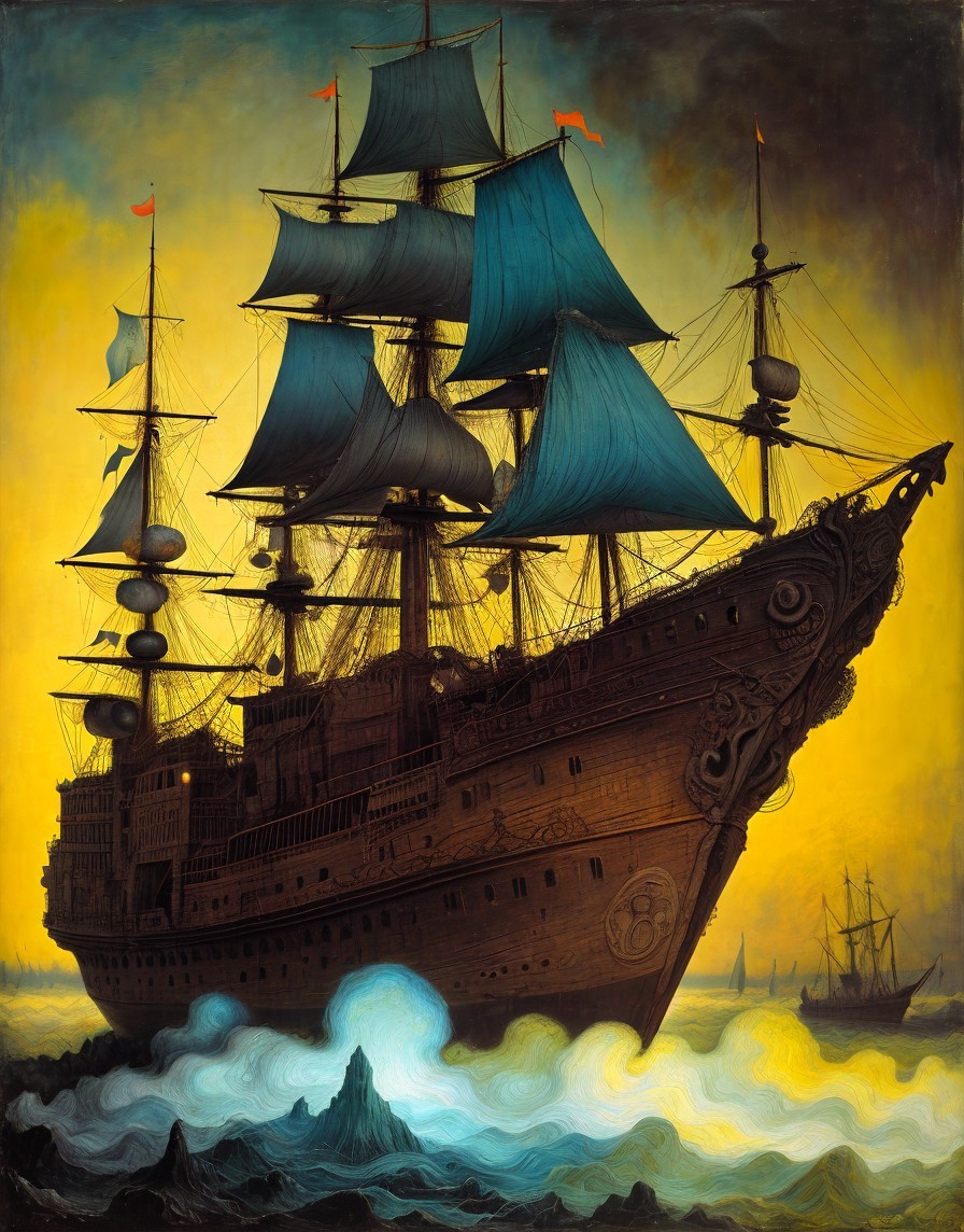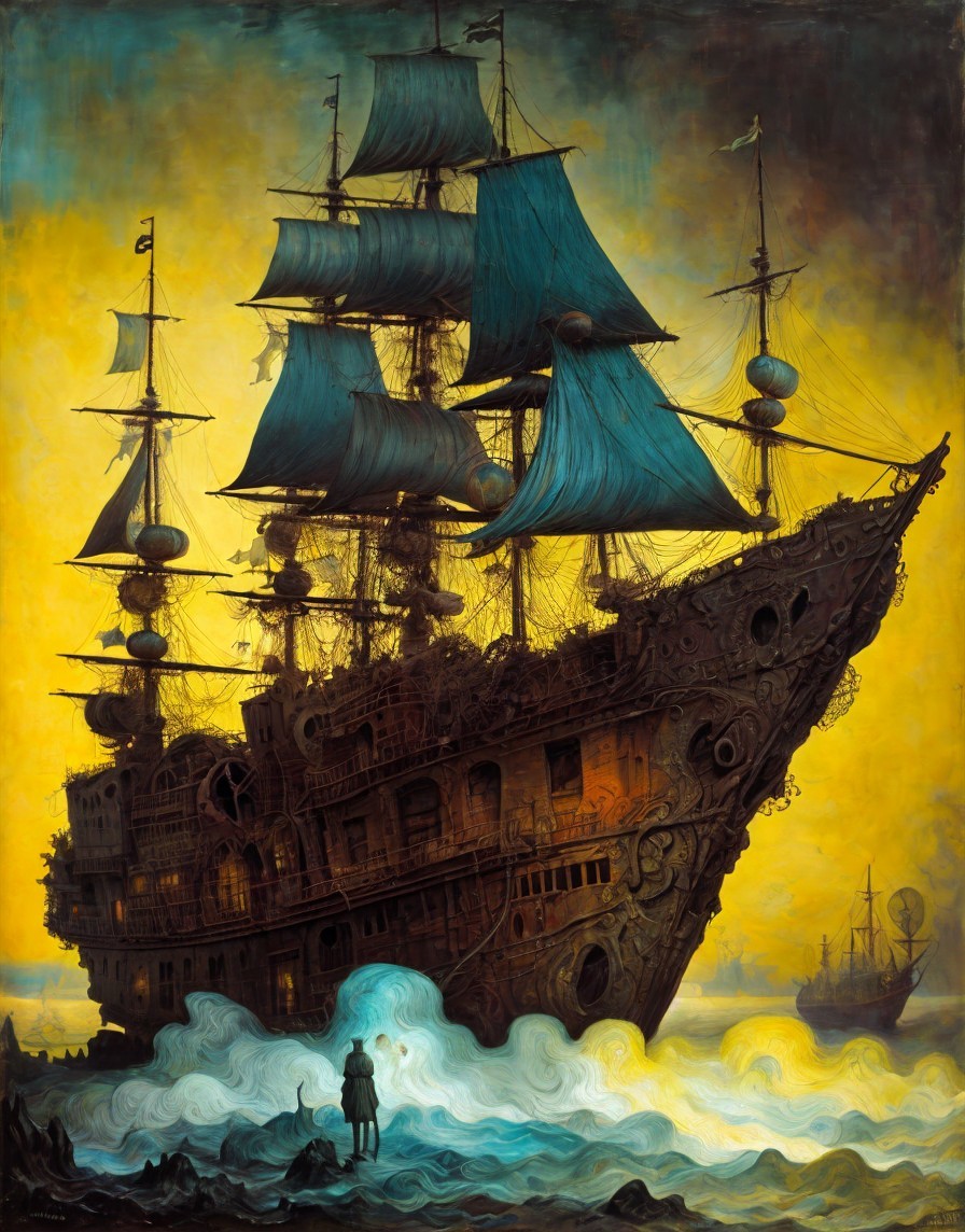 + Prompt:ghost ship: evolution by design, theme "mimetic" : numerical art, Modern Primitive Art , visionary art:, DUST, Impasto Palette Knife, sil tone, by Adolf Wölfli, Rembrandt van Rijn, Roberto Matta, Henri Rousseau,