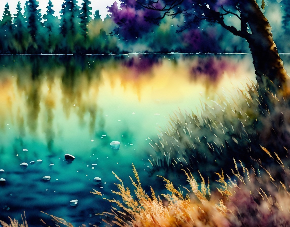 A child stands by a serene lake at twilight, surrounded by nature, reflecting on the calm water.