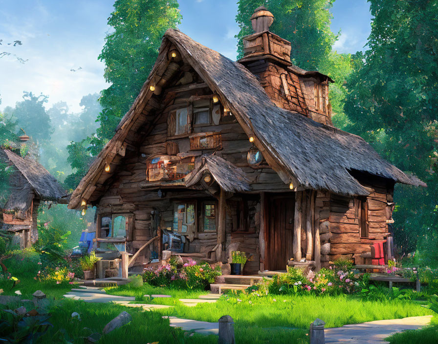 Wooden cottage with stone chimney in lush forest setting at dusk