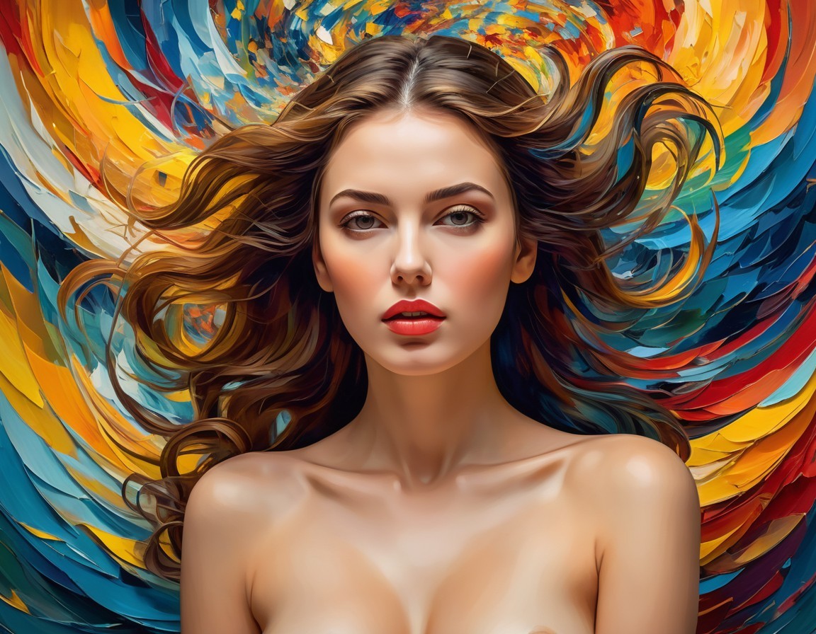 The image features a striking portrait of a woman with flowing hair, set against a vibrant, swirling background of bold colors. Her expression is serene, enhancing the artistic depth of the piece.