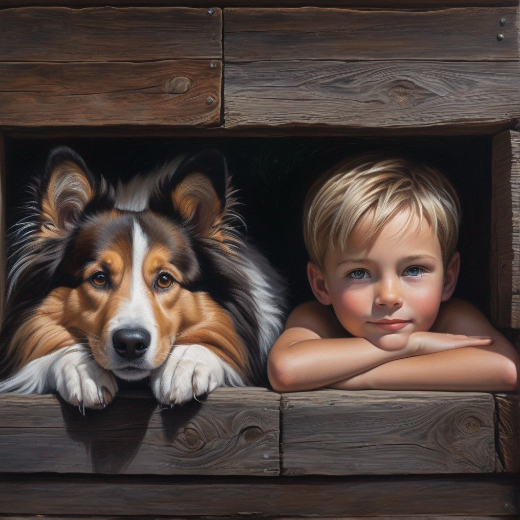 A boy and a dog lie next to each other inside a wooden structure, both gazing directly ahead with earnest expressions. Prompt by 黃永弘 at Creative AI and Prompt Sharing.