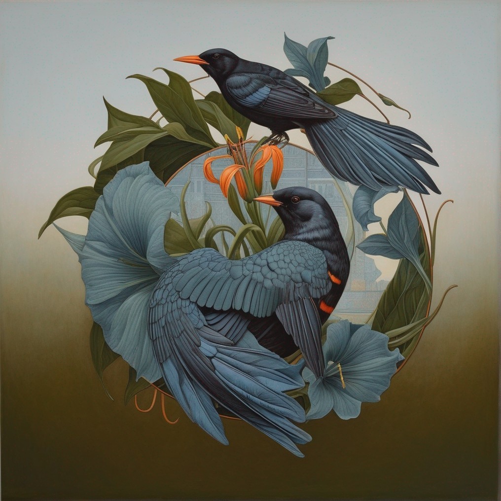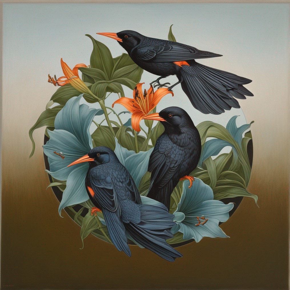 + Prompt:Create a geometric arrangement, bound by a circle, of red winged blackbirds and orange Tiger Lilies. In the style of Tiffany Bozic, Boris Indrikov, and Edward J Detmold, MC Escher