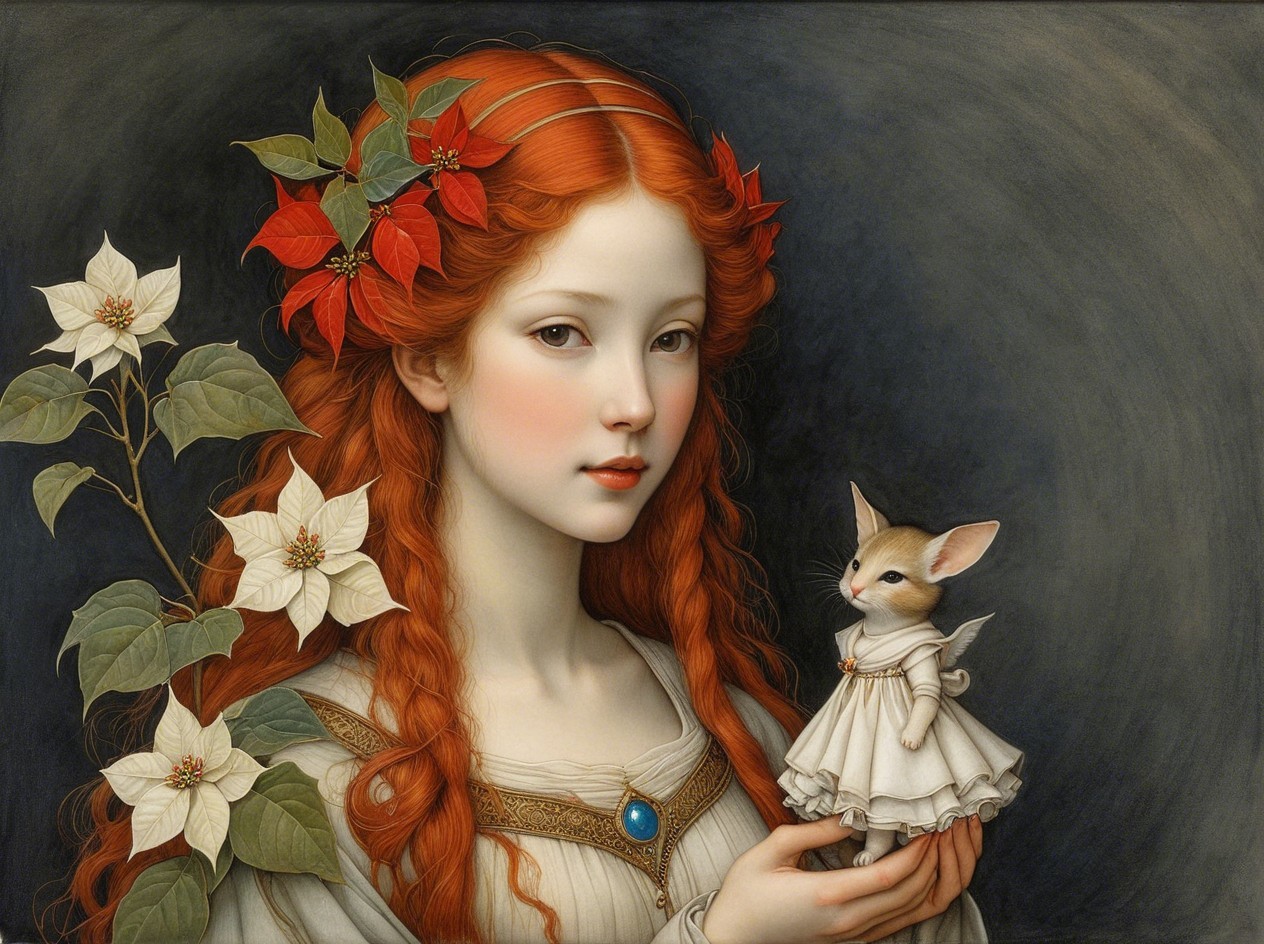 A captivating, hyper-realistic fantasy portrait captures a young woman with fair skin, light-colored eyes, and long, flowing red hair falling over her shoulders. She is depicted from the waist up, facing forward with a gentle, inviting expression. Red poinsettia blooms are woven into her hair,