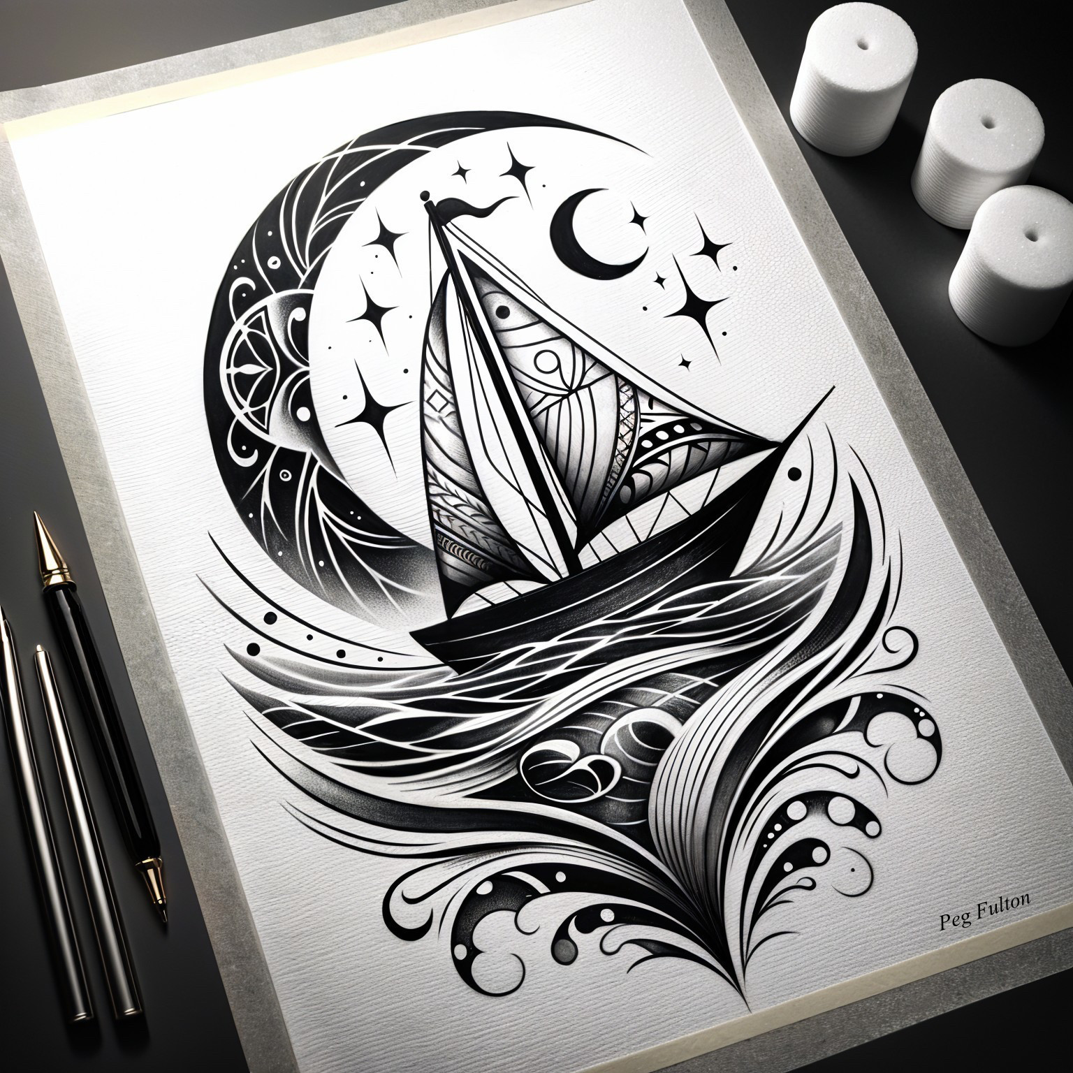 The image features a stylized black and white illustration of a sailboat on waves, surrounded by intricate patterns, a crescent moon, and stars, creating a dreamy nautical scene.