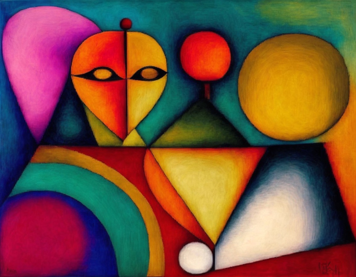 The image features an abstract composition with vibrant shapes and colors, including circles, triangles, and curves, creating a harmonious blend of forms that evoke a sense of emotion and movement.