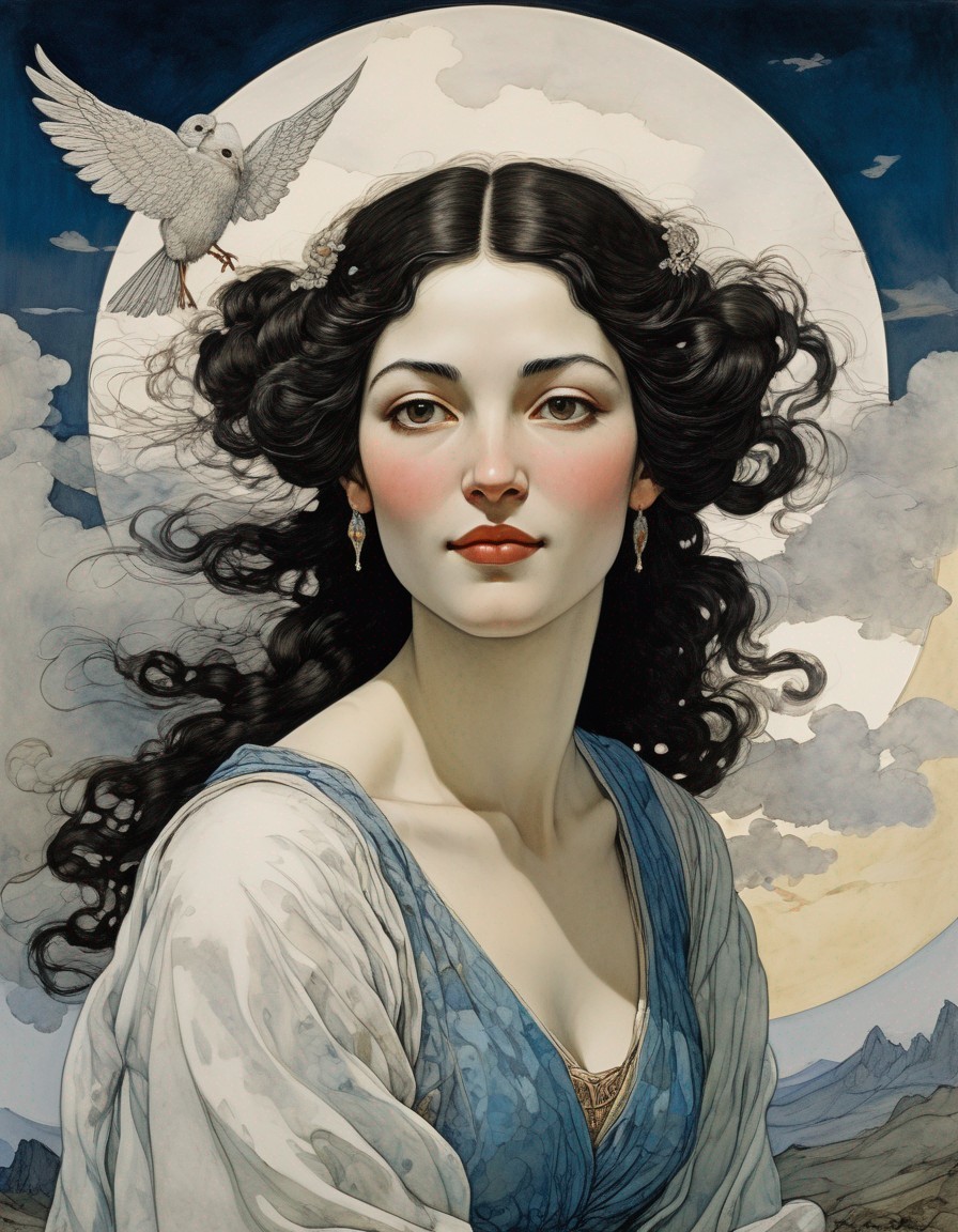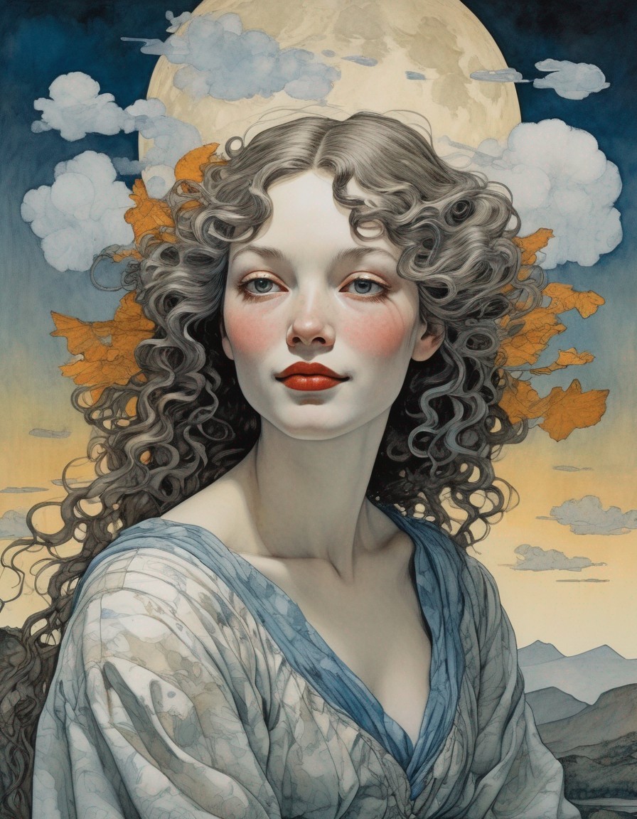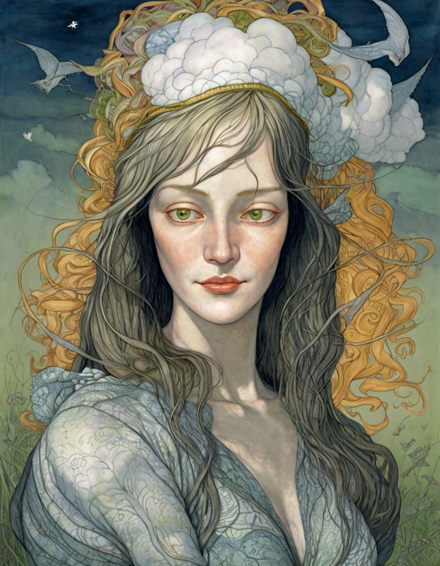 Beautiful nymph. 3rd century Persian miniature art. Mysterious, ethereal, alluring . Enigmatic smile. Beautiful clouds at dawn. , andrew wyeth, edward gorey, hope gangloff, spare style, liminal