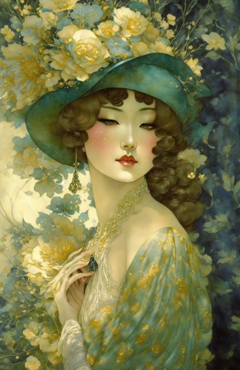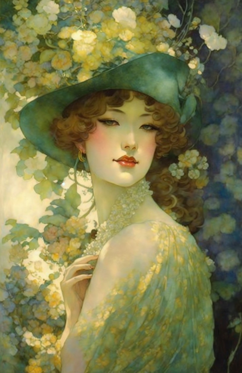 A glamorous woman in vintage attire, adorned with pearls and a stylish hat featuring flowers. The background features intricate art deco elements, enhancing her elegant aura.