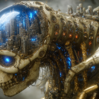 A colossal biomechanical skull looms in the haze, its metallic anatomy intricately woven with gold filigree and pulsating blue light. Beneath the transparent dome of its cranium, an entire metropolis rises — a labyrinth of golden skyscrapers, glowing with synthetic life. The creature appears both ancient and futuristic, as if forged by the combined visions of HR Giger, Zaha Hadid, and Alex Grey. Each sinew and wire hums with electric intelligence, suggesting that within this mechanical relic, civilization itself is both born and entombed. The fusion of skeletal decay and technological brilliance evokes the haunting poetry of a world where the machine has become the mind — and the mind, the city.