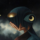 A surreal figure cradles a “head” made of dark fabric, featuring a glowing orb and crescent moon. The background is a mystical night sky filled with stars and swirling clouds.