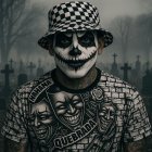 A person stands in nature with a striking skull face paint, wearing a black cap and chains. Their tattoos peek from under the skin, adding to the intense and artistic appearance.