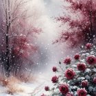 A serene winter landscape features a winding path through a snowy field, vibrant pink roses dusted with snow, and frosty trees, creating a beautiful contrast against the soft morning light.