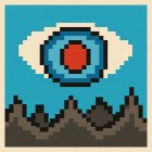 The image features a large, stylized eye in vibrant colors, hovering above dark mountains against a bright blue background. The eye's intricate design draws attention, evoking a sense of wonder.