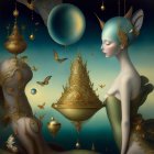 A surreal landscape features a serene, ethereal figure with unique headgear, surrounded by floating islands, butterflies, and whimsical structures, evoking a dreamlike atmosphere.