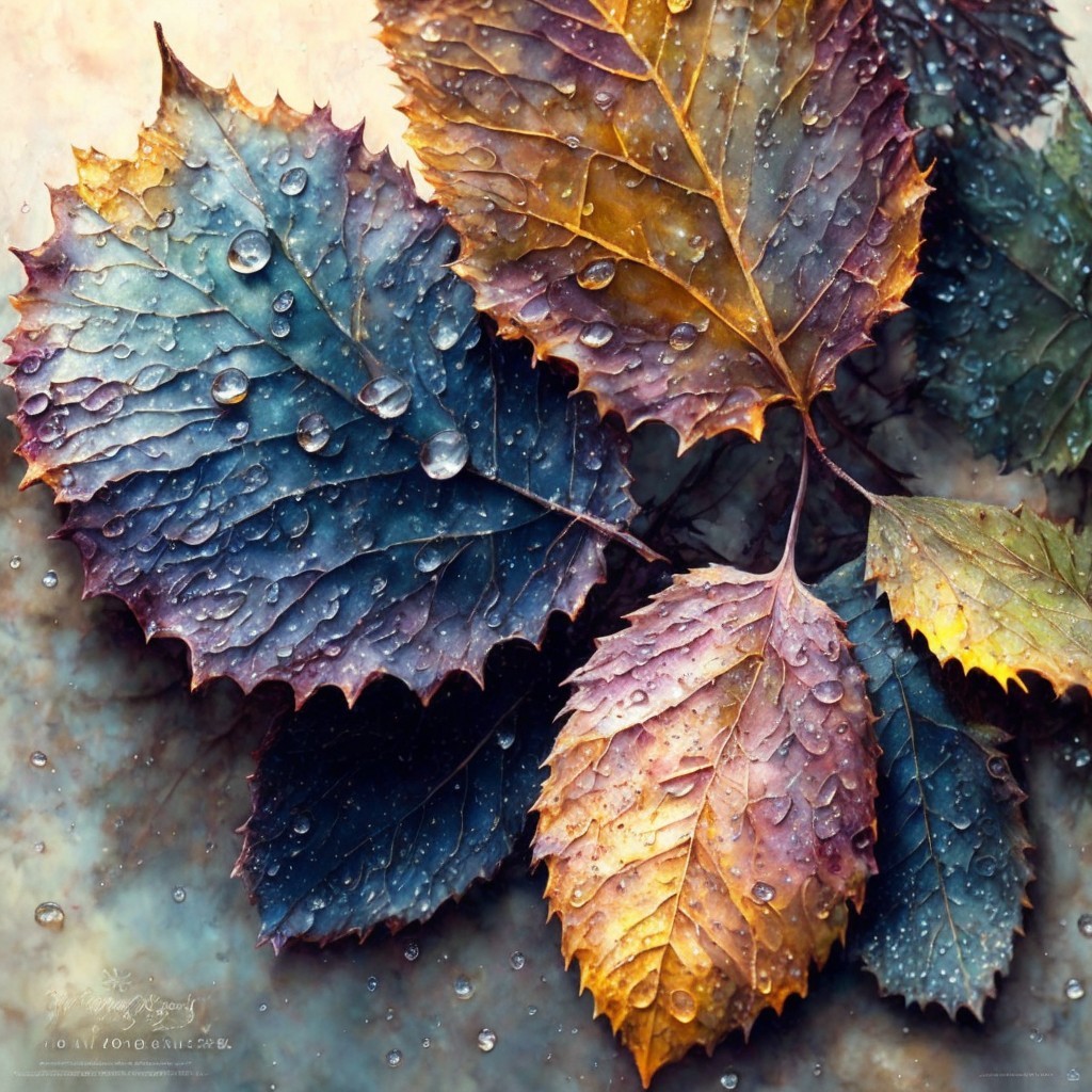 The image features vibrant leaves in shades of blue, purple, and gold, glistening with water droplets. The intricate textures and colors create a striking and refreshing natural scene.