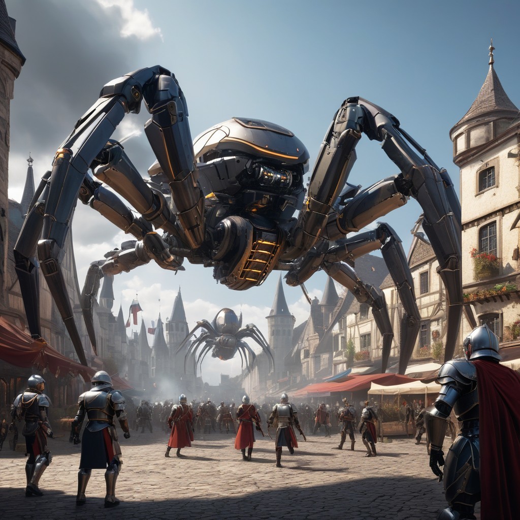 A giant robotic spider towers over a medieval cityscape as armored knights and a girl confront it, with small drones flying around.