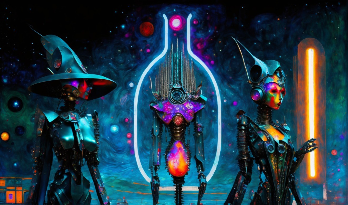 The image features three futuristic humanoid robots with intricate metallic designs and vibrant details, set against a deep blue background filled with abstract shapes and celestial motifs.
