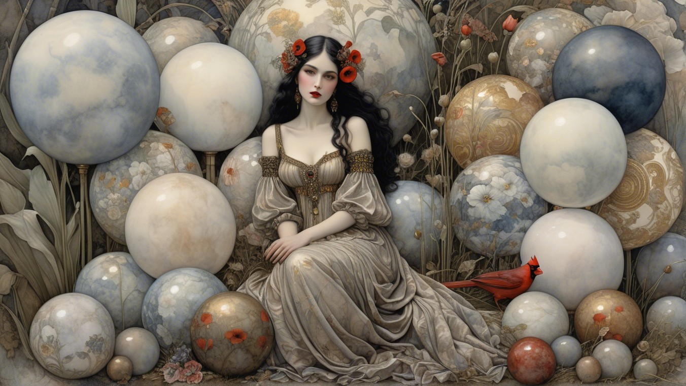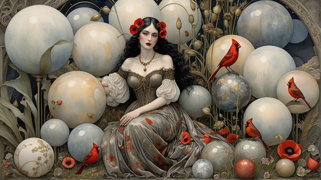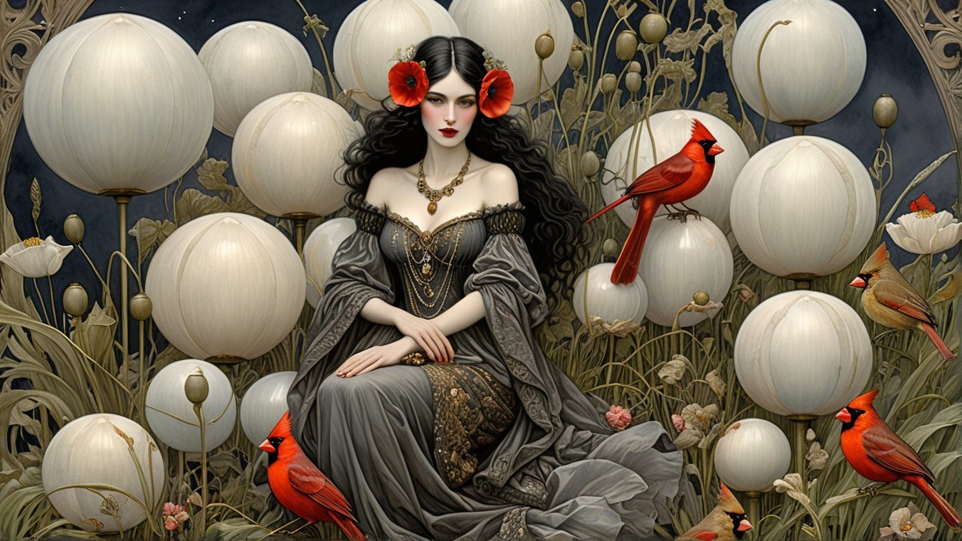 The image features a woman in a flowing black gown adorned with flowers, surrounded by large, spherical white plants and vibrant red cardinals, creating a mystical and enchanting atmosphere.
