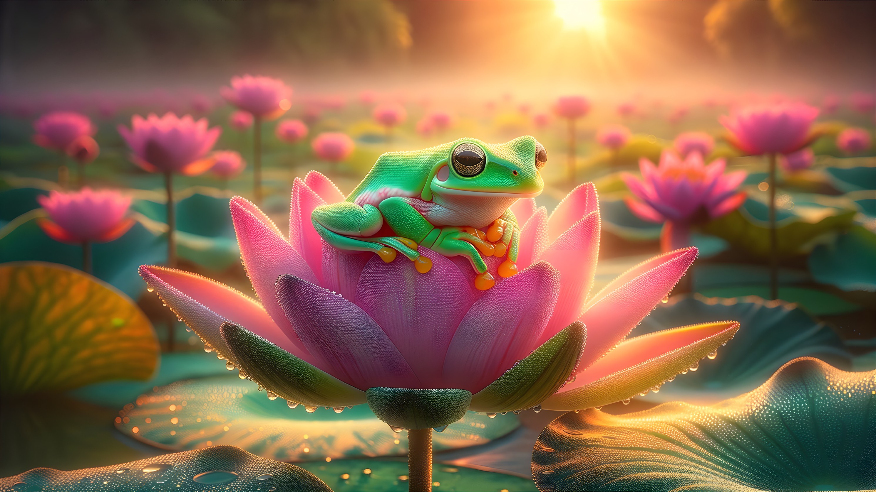 An exquisite nature scene capturing a lotus flower, a charming frog, and delicate dew drops. The pastel colors, intricate details, and vibrant hues create a mesmerizing and award-winning quality image. The high-resolution photography showcases a realistic and elegant masterpiece with dynamic lighting and ultra-detailed realism.