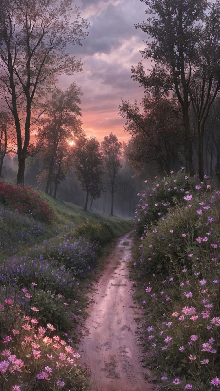 A serene landscape features a rustic farmhouse nestled among vibrant autumn trees and blooming wildflowers, with a gentle stream winding through the tranquil scene under a colorful sky.