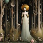 A surreal scene unfolds in a magical forest, featuring a serene figure in a flowing gown surrounded by enchanting creatures, vibrant flora, and whimsical elements, evoking a dreamlike atmosphere.