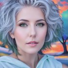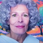 A close-up portrait of a woman with short, curly silver-green hair and striking green eyes. She has a natural, fresh makeup look, evoking a sense of calm and beauty against a colorful background.