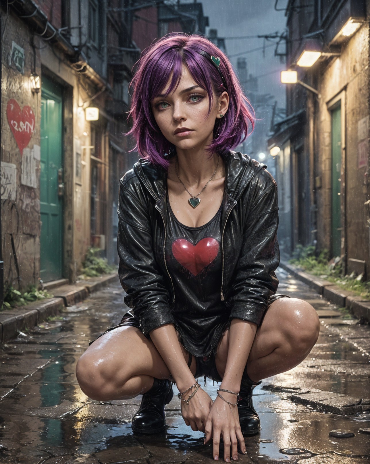 (Original from starryai/Luna + Ai Up) - A woman with purple hair crouches in a rainy alleyway, wearing a black leather jacket, and looking pensive.