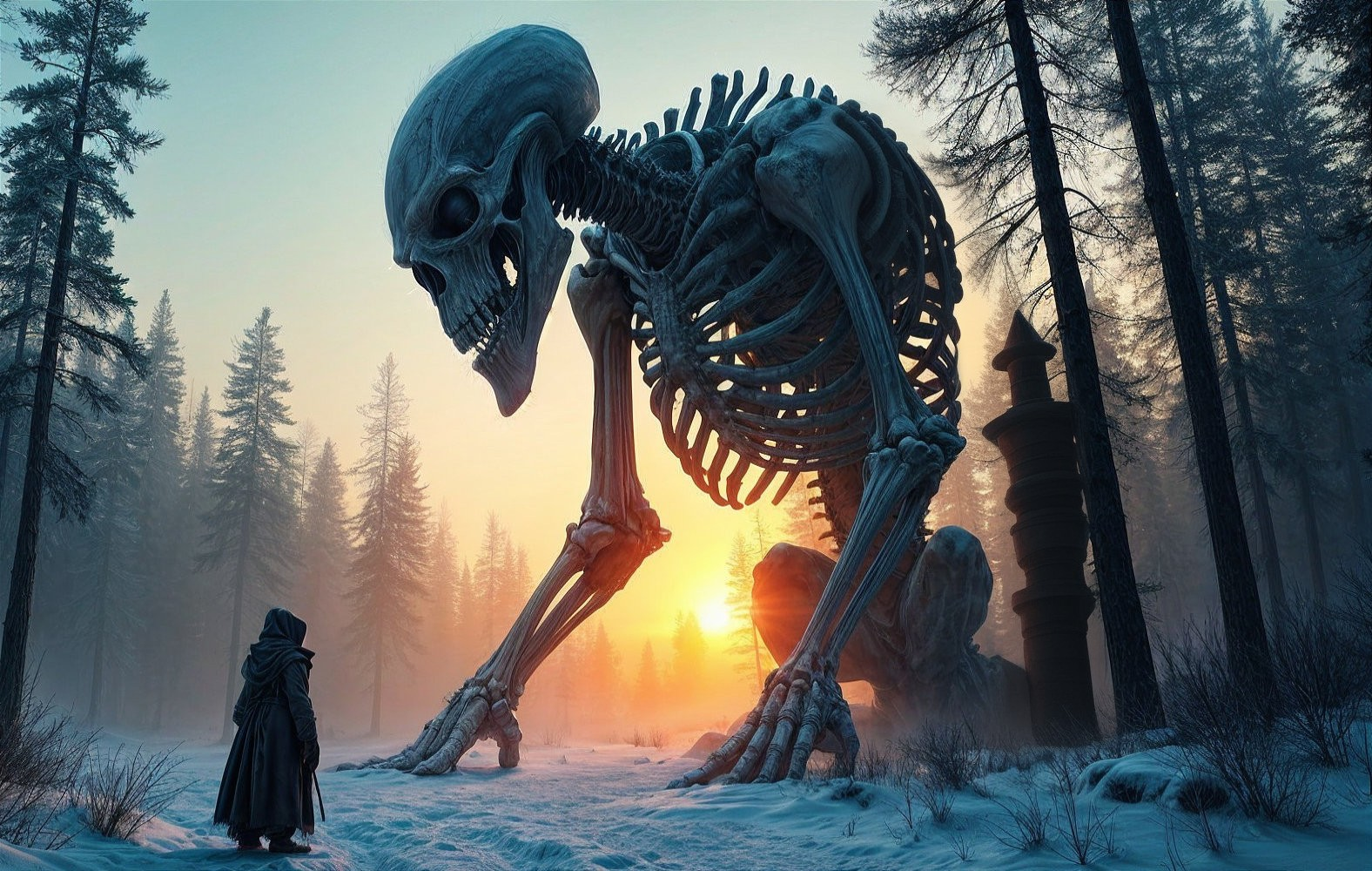 In a snowy forest at sunrise, a colossal skeletal figure looms over a hooded figure. Tall trees frame the scene, creating a mystical and eerie atmosphere.