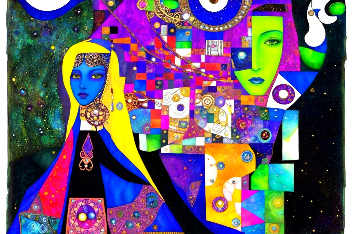 Prompt: witches of the surreal cosmos, Patchwork by Meghan Duncanson and Jennifer Lommers and Didier Lourenço. Eldritch details. Intricate surreal textures. Metallic surfaces. Metallic paints BY Gustav Klimt, minor clockwork and intricate circuits in textures. circuits. razor. wire.