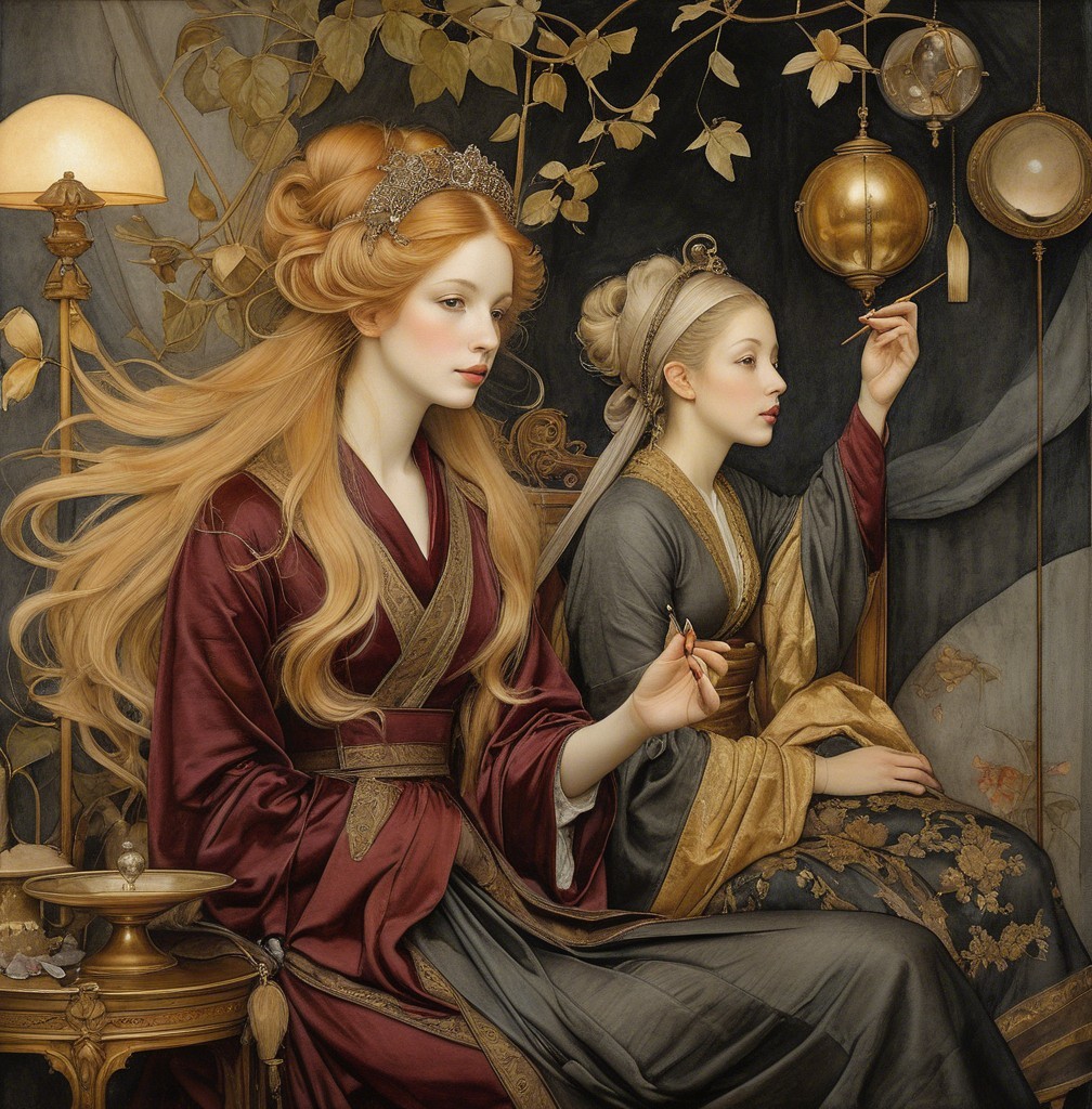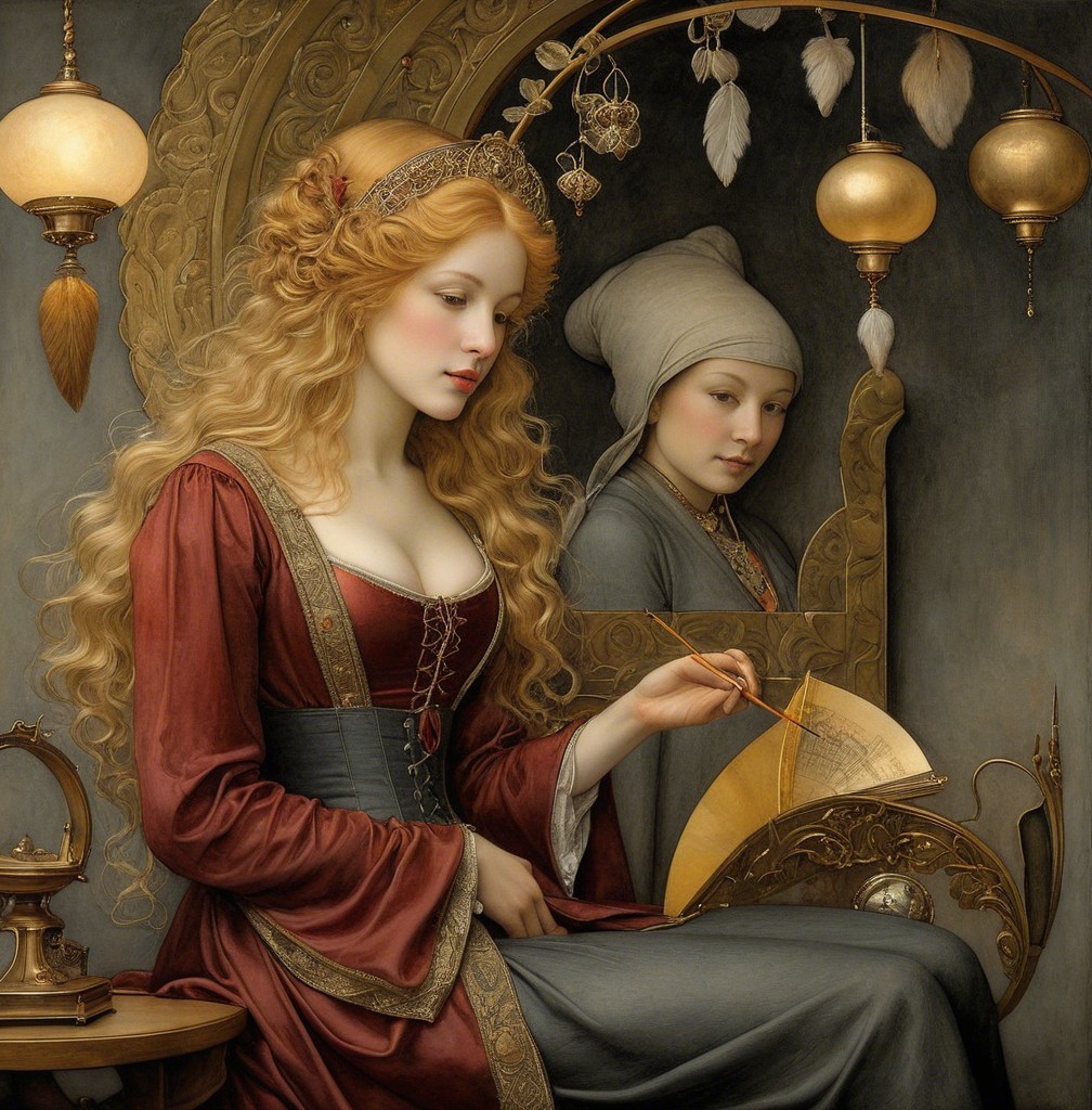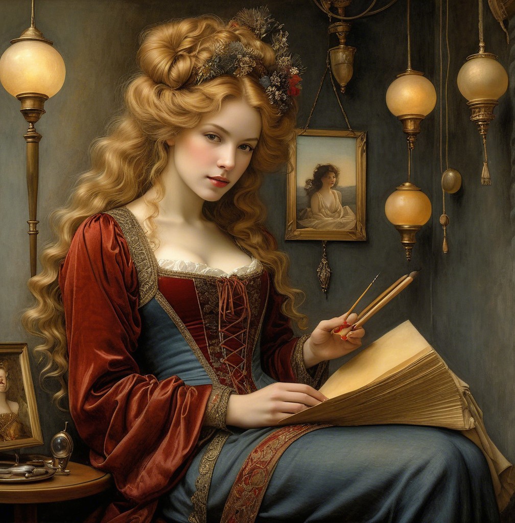 A stunning woman with flowing red hair lounges elegantly, wearing vintage lingerie. She gazes at a mirror, while a white rabbit sits nearby, adding a touch of whimsy to the classic scene.