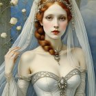 A hauntingly beautiful figure with butterfly wings and a delicate crown of flowers. Her ethereal pose showcases intricate skeletal details, blending fragility and strength in a mystical atmosphere.
