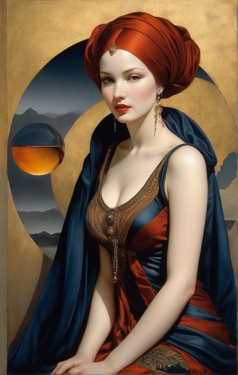 An illustrated woman with a red turban, gold jewelry, and a blue cloak stands before a globe, exuding elegance and an air of mystique.