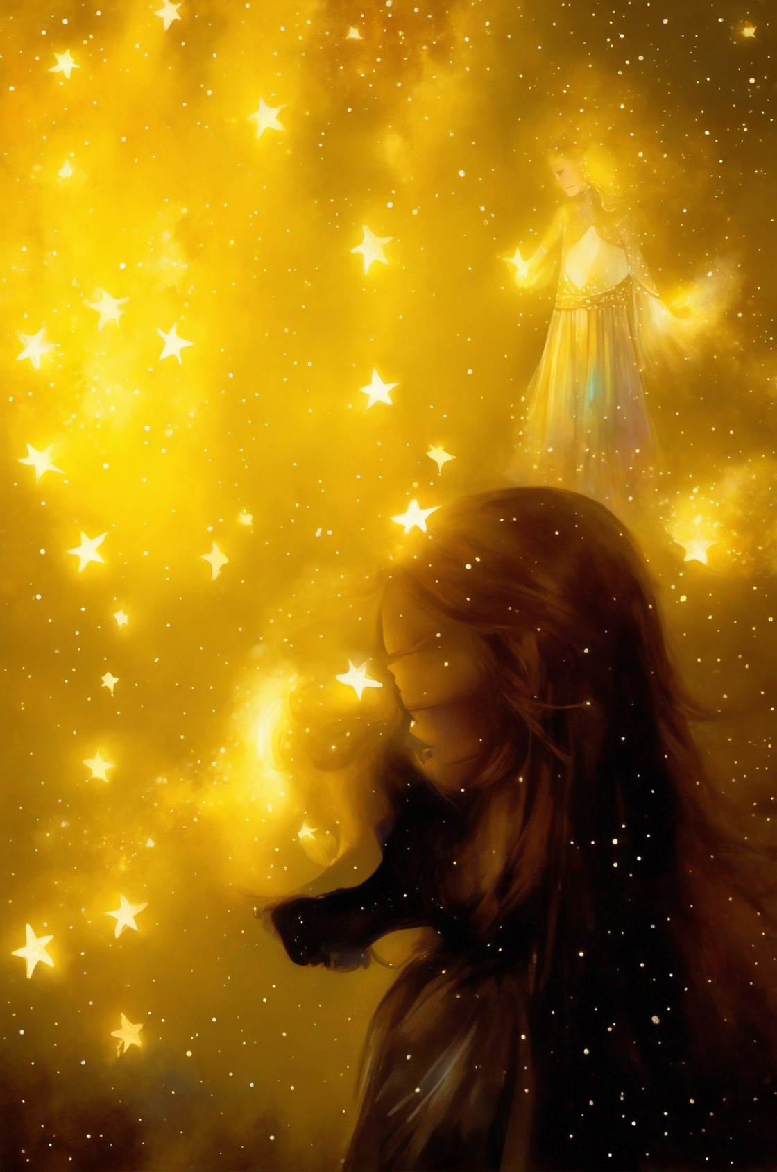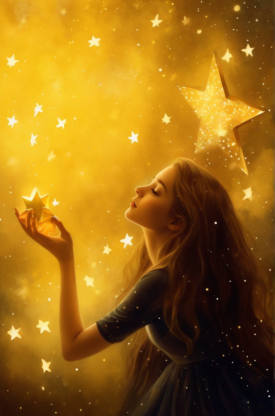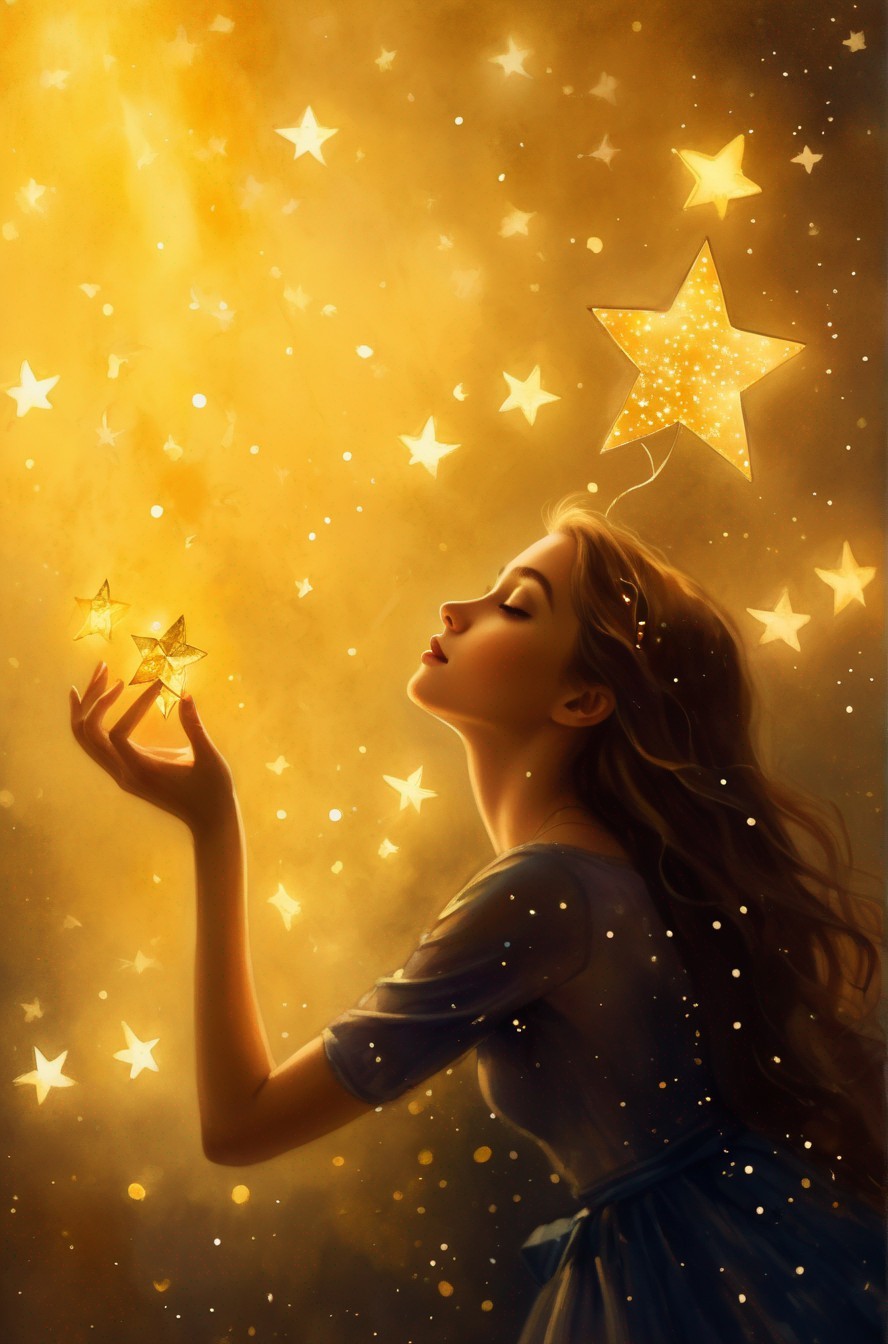 + Prompt:The stars collector. Delicate watercolor illustration, of a young modern princess, collecting fallen glowing golden stars, whimsical, beautiful, poignant, touching.slim beautiful body