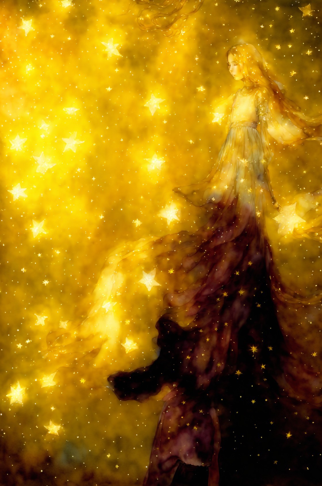 The stars collector. Delicate watercolor illustration, of a young modern princess, collecting fallen glowing golden stars, whimsical, beautiful, poignant, touching.slim beautiful body