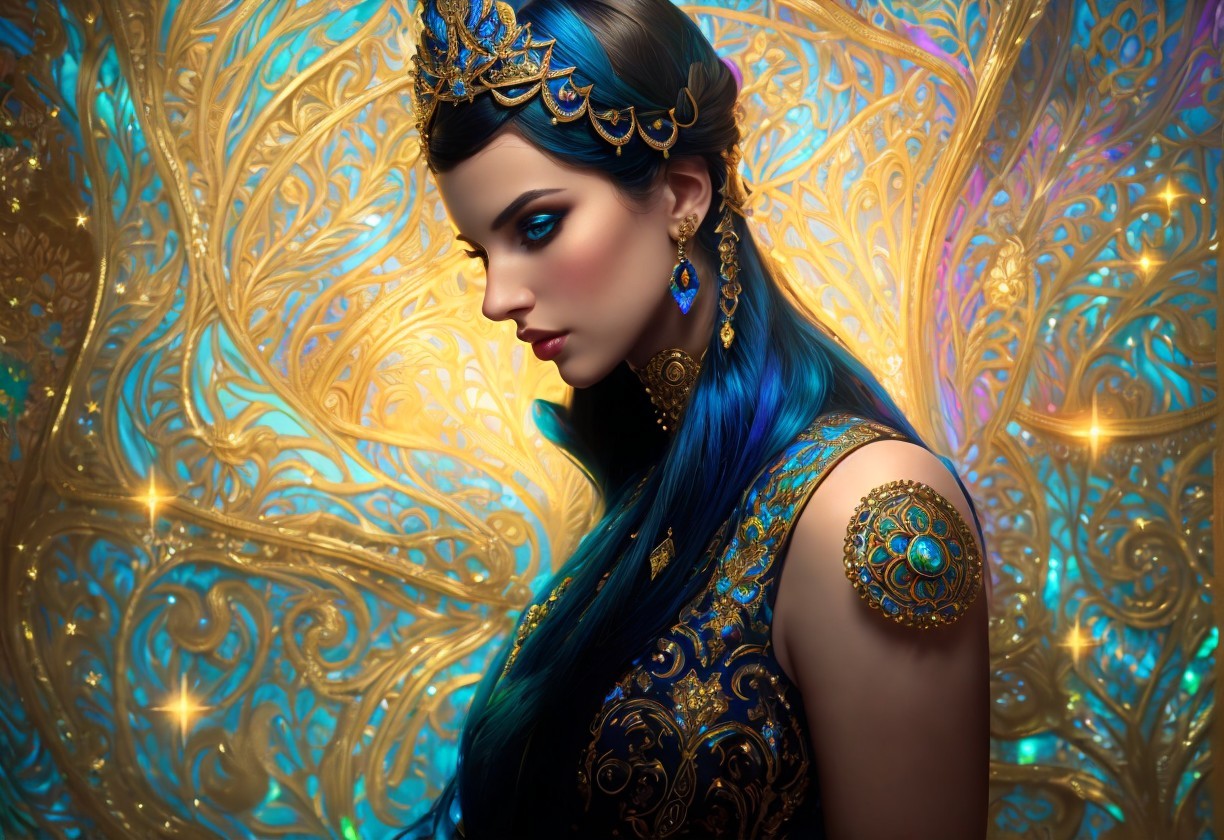 + Prompt:high contrast, intricate patterns, dramatic lighting, Laurel Burch inspired vivid colors, digital painting.opulence, lavish and glamorous gleam and shimmer, bewitching, magnificent, fantastical, mystical, magical, luxurious and sparkling blue and cadet radiance, masterpiece, high fantasy